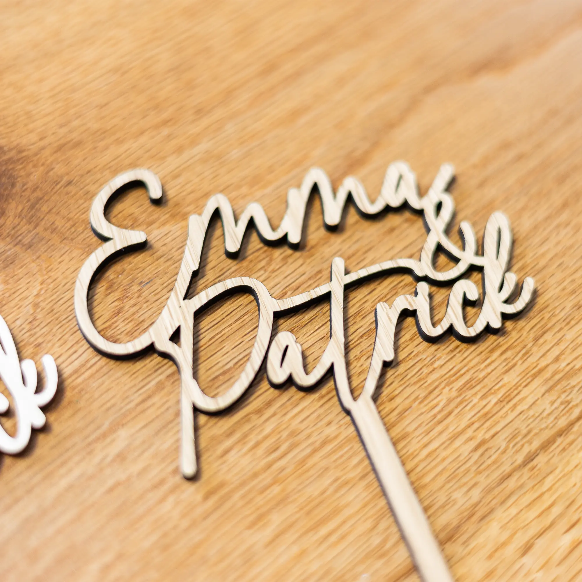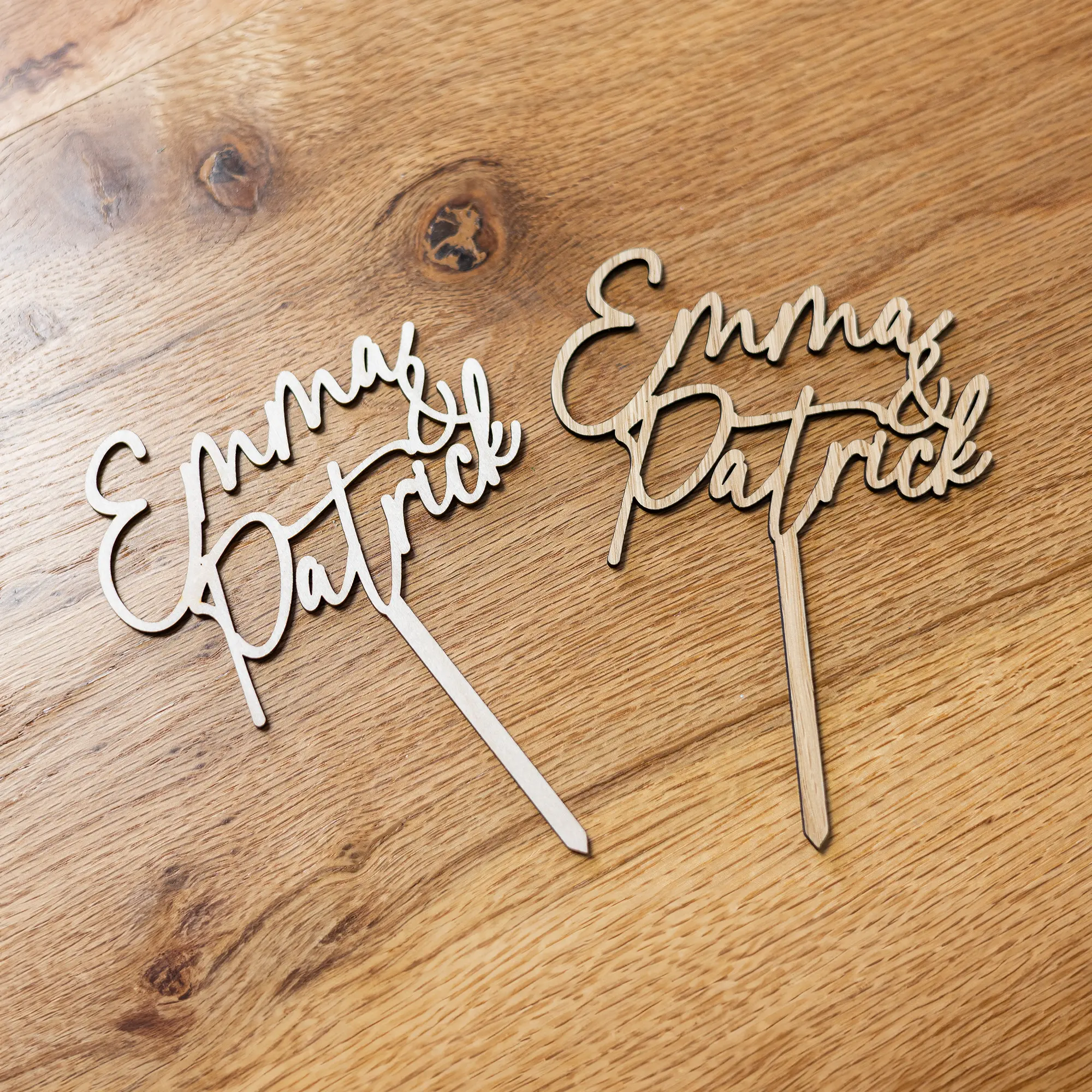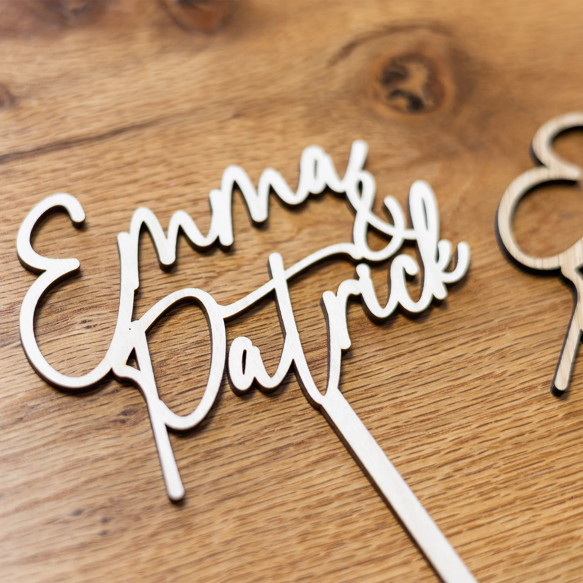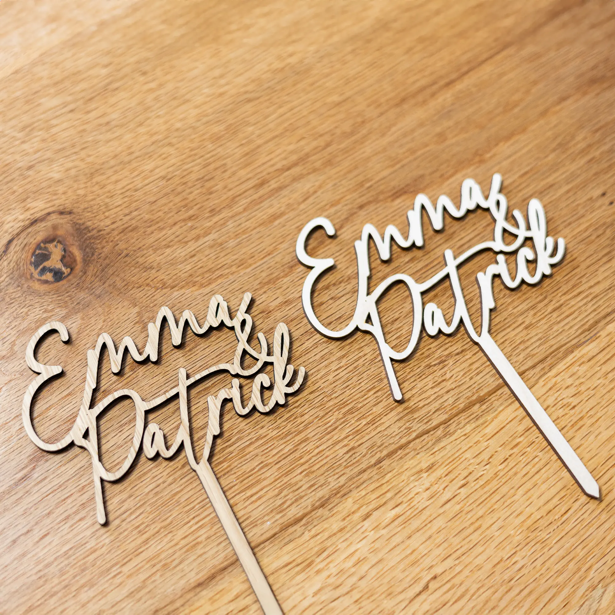 Mit unserem Caketopper mit 2 Namen als elegante Schriftzüge könnt ihr eurer Hochzeitstorte ein ganz besonderes und persönliches Highlight aufsetzen. Sei es für die Torte, euren Kuchen oder auch Muffins und Cupcakes zur Feierlichkeit, durch die verschiedenen Größen könnt ihr jede Art von Gebäck zu eurer Feierlichkeit mit euren Namen oder dem Namen des Paares bzw. Hochzeitspaares dekorieren. Die Tortenstecker, personalisiert mit euren Wunschnamen erhaltet ihr in einem eleganten und filigranen Design, bei welchem die Namen als Schriftzug präzise mittels Lasercut ausgeschnitten werden. Dadurch entsteht ein einfaches und schönes Gesamtbild, welches ihr problemlos in eure Torten, Kuchen oder auch kleinere Törtchen und Gebäck stecken könnt. Durch das einfache aber dennoch elegante Design passt der Caketopper aus Holz perfekt zu jeder Art von Hochzeitstorte und rundet damit die wichtige Torte für euren ganz besonderen Tag ab. Anpassung an gewisse Farben können auch durch die Wahl aus den zwei Holzarten Eiche und Buche noch angepasst werden. Zudem eignet sich der Caketopper nicht nur für Hochzeiten, sondern auch für Verlobungsfeiern oder anderen Feierlichkeiten bei denen ihr eure Liebe oder auch Freundschaften auf eine ganz besondere Weise feiern möchtet. Setzt eurer Torte das Highlight auf mit diesem ganz besonderen und persönlichen Caketopper!