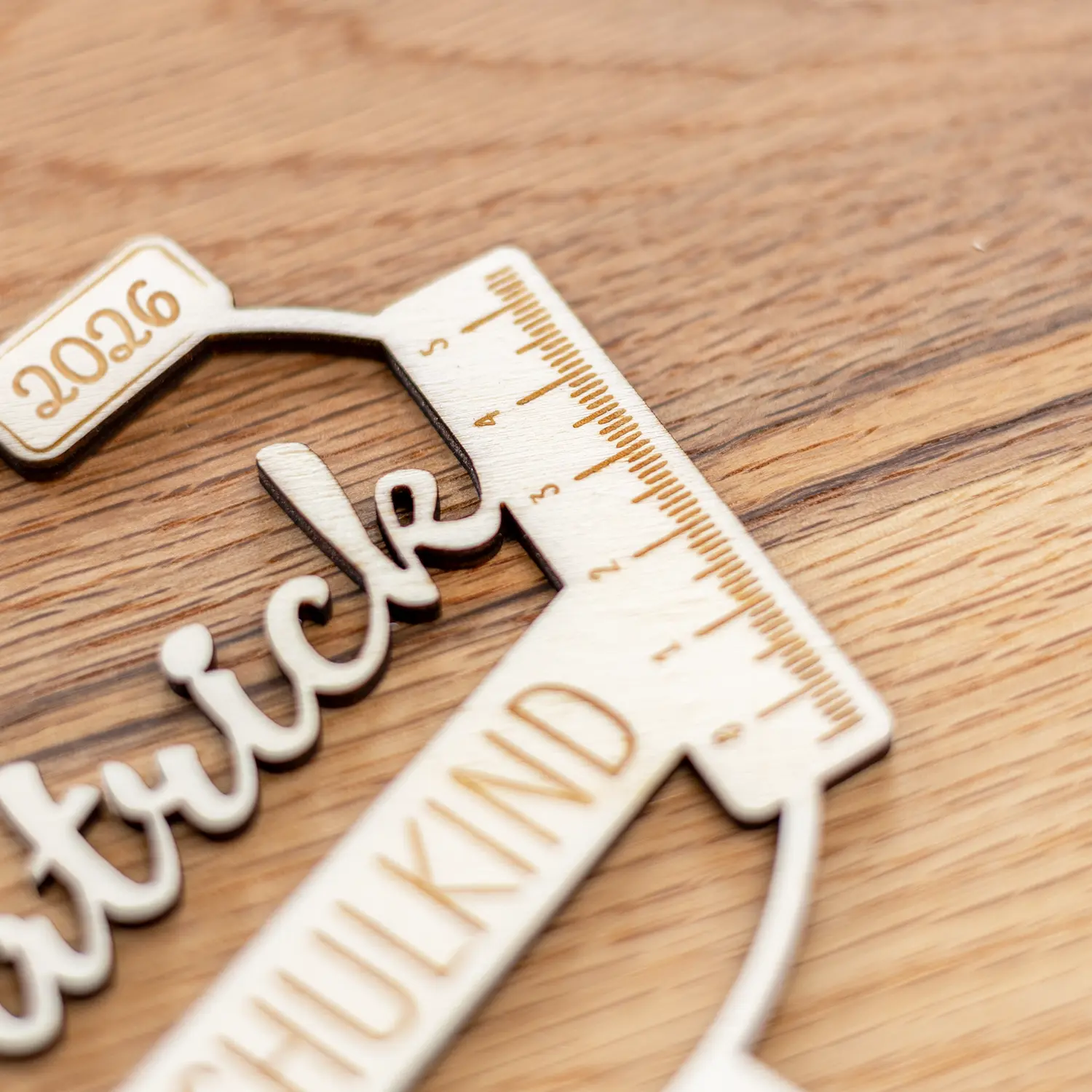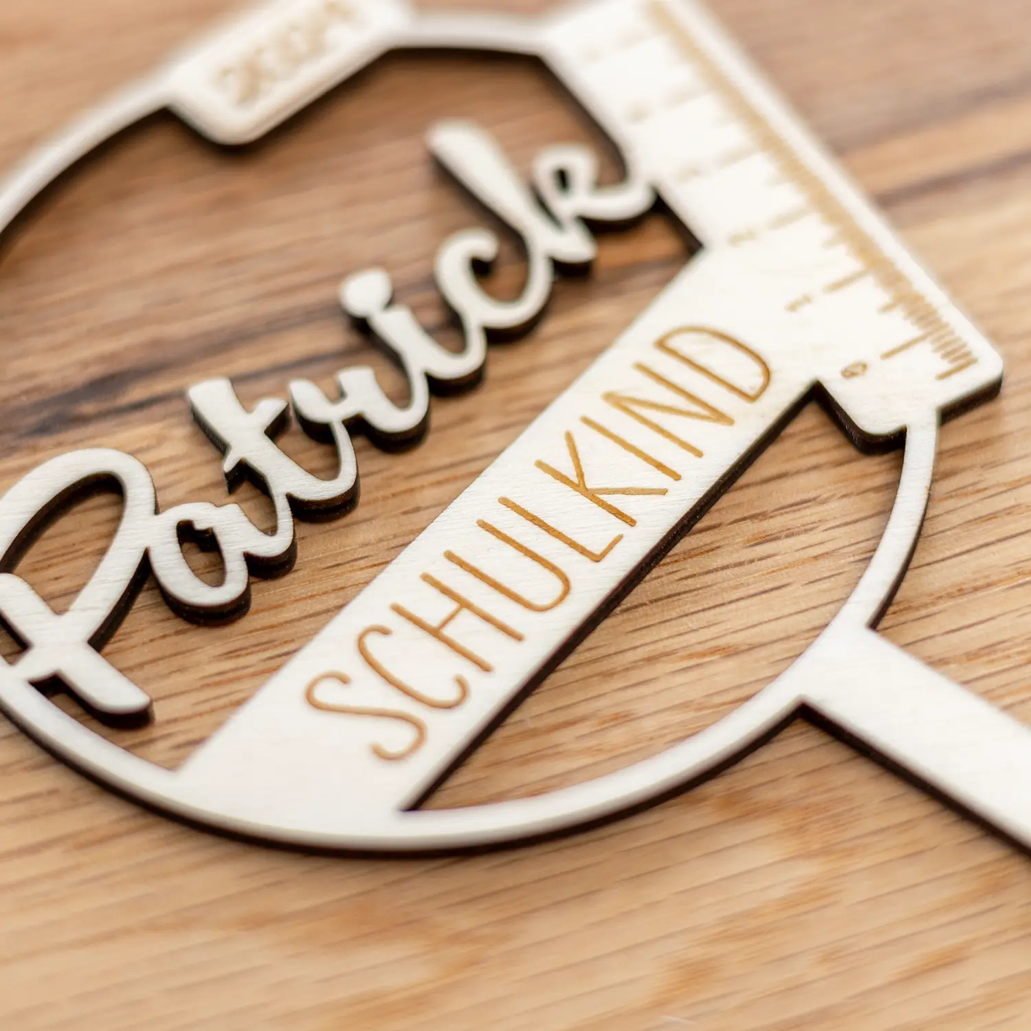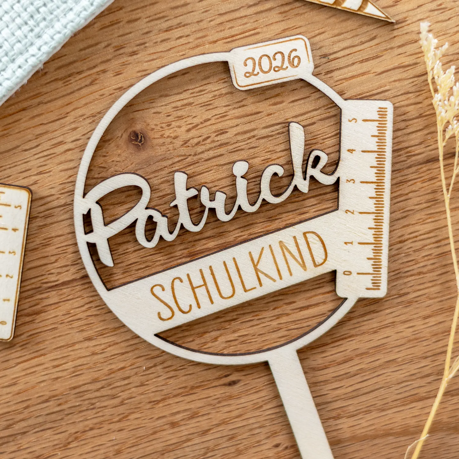 Ein ganz besonderer Caketopper, für einen ganz besonderen Meilenstein im Leben eurer Kinder. Mit dem personalisierten Caketopper Schulkind macht ihr eure Torte oder euren Kuchen für die Einschulungsfeier eure Kinder zu einem ganz persönlichen Highlight. Zudem eignet sich der Caketopper auch als schönes Geschenk an Enkelkinder und Patenkinder, denen man zur Einschulung etwas Persönliches schenken möchte. Und durch die Nutzung der natürlichen Materialien ist der Kuchenstecker aus Holz auch nach den Feierlichkeiten keine Wegwerfware. Einfach abwischen oder bereits im Voraus den Stiel mit Frischhaltefolie eingewickelt, könnt ihr den Cake-Topper auch als Erinnerungsstück oder Dekoration im Kinderzimmer aufhängen und behalten. Dadurch habt ihr mit dem Caketopper nicht nur eine individuelle Einschulungsdekoration, sondern auch eine Erinnerung an einen wichtigen Tag eurer Kinder.