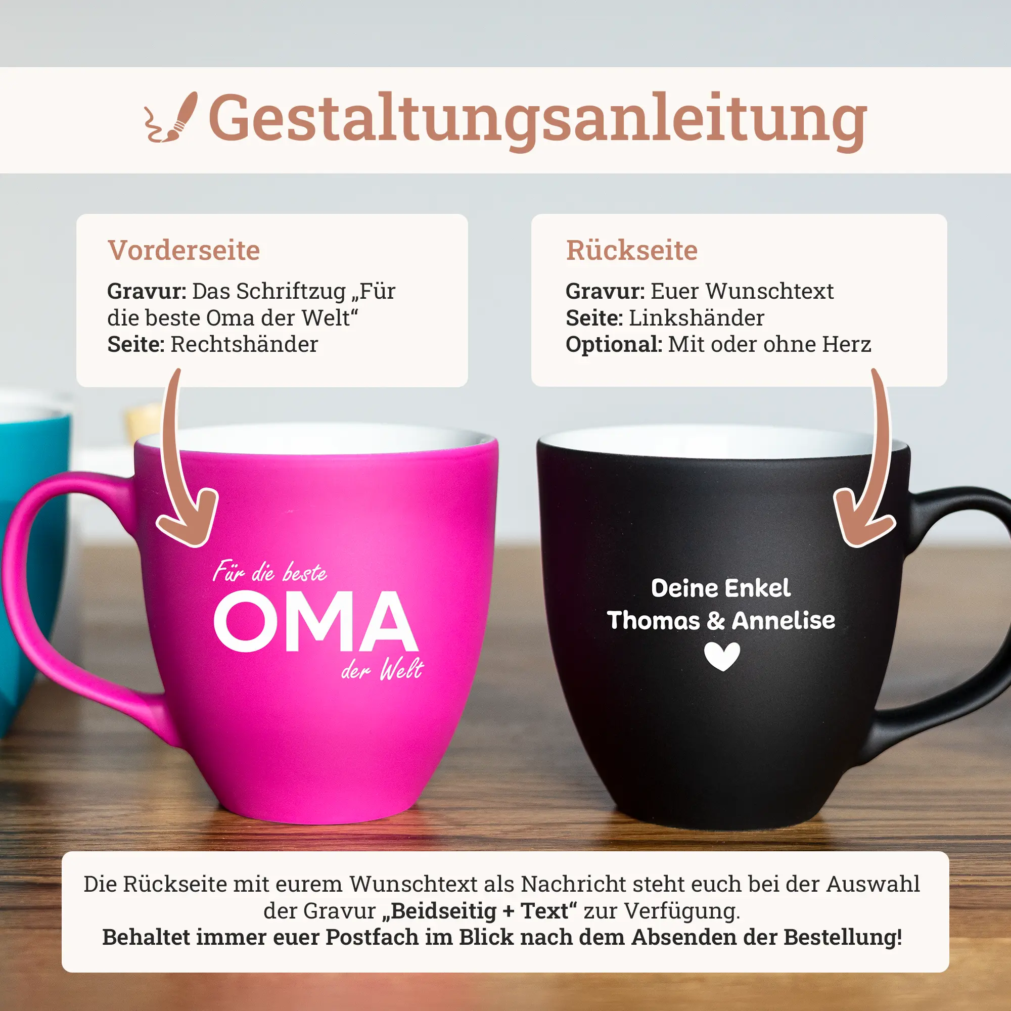 Das perfekte Geschenk für eure Oma – Hochwertige Porzellan-Tasse mit Wunschgravur in verschiedenen Farben