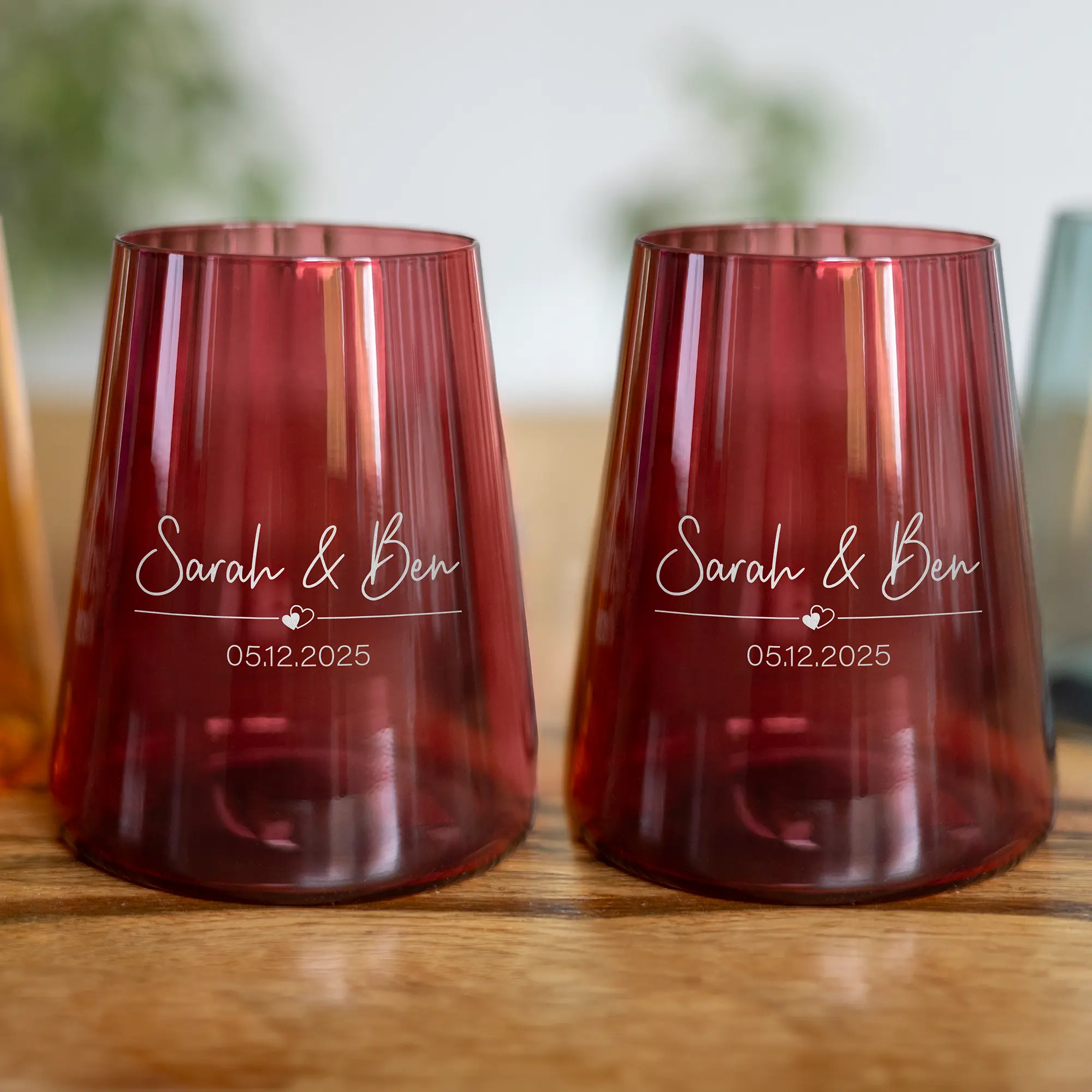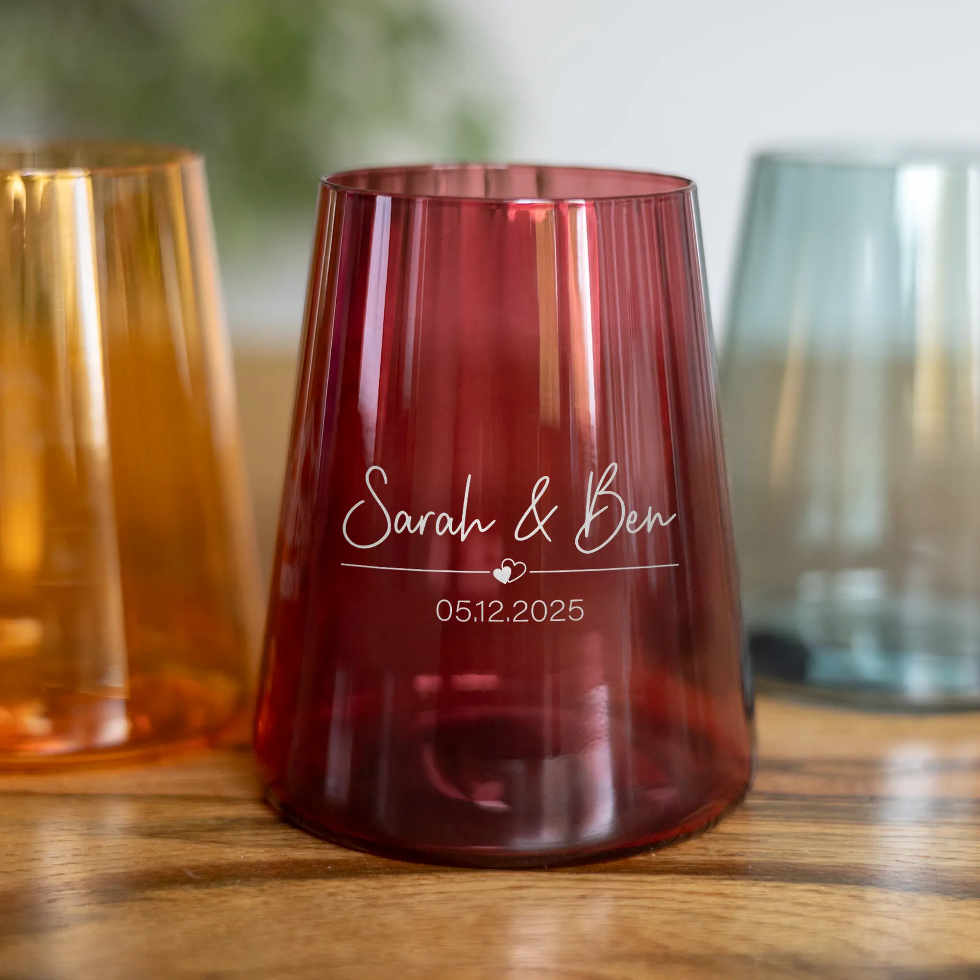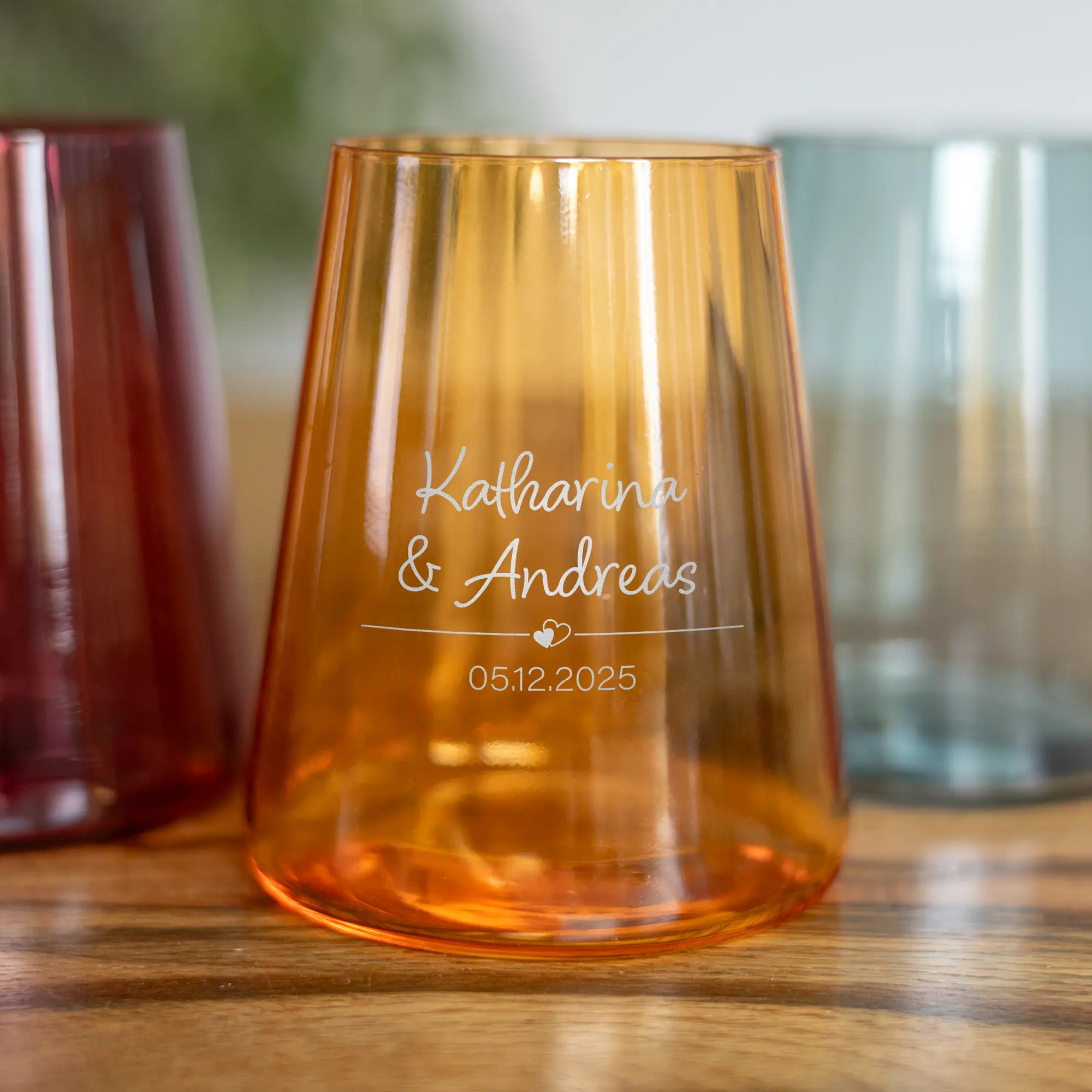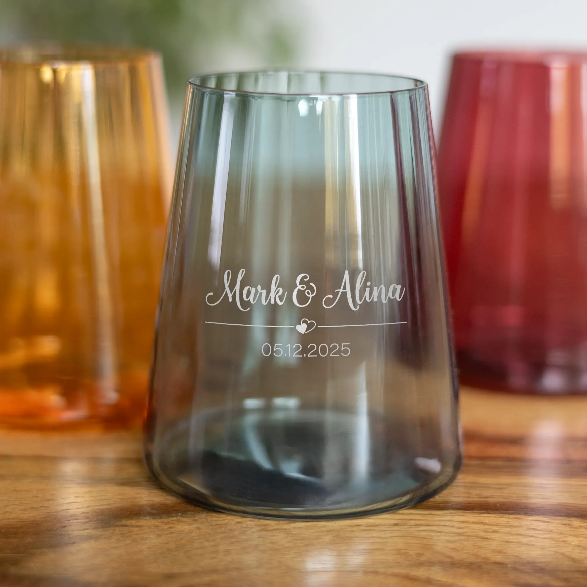 Bei der Gestaltung der Gläser aus hochwertigem Kristallglas stehen euch die drei Trendfarben Orange, Bordeauxrot und Blaugrün sowie 15 verschiedene Schriftarten zur Auswahl. Bei der Gravur werden eure beiden Namen gemeinsam mit eurem Wunschdatum getrennt mit einem einfachen Strich und einem niedlichen Herz-Symbol in der von euch gewählten Farbe auf die Gläser eingraviert. Das Ergebnis ist ein einfaches, aber dennoch filigranes Design, das euch und eure Liebe präsentiert. Weitere Wünsche bezüglich Positionierung und individueller Gestaltung könnt ihr uns nach der Bestellung per E-Mail mitteilen. Aufgrund der vielen Auswahl- und Gestaltungsmöglichkeiten sind die Trinkgläser optimale Geschenkideen für Geburtstage, Hochzeiten, Weihnachten oder andere besondere Anlässe, an denen ihr anderen eine persönliche Freude machen möchtet. Auch für Weinliebhaber sind die Gläser perfekt, da sie durch ihre Form und Füllmenge optimale Weißweinbecher sind.