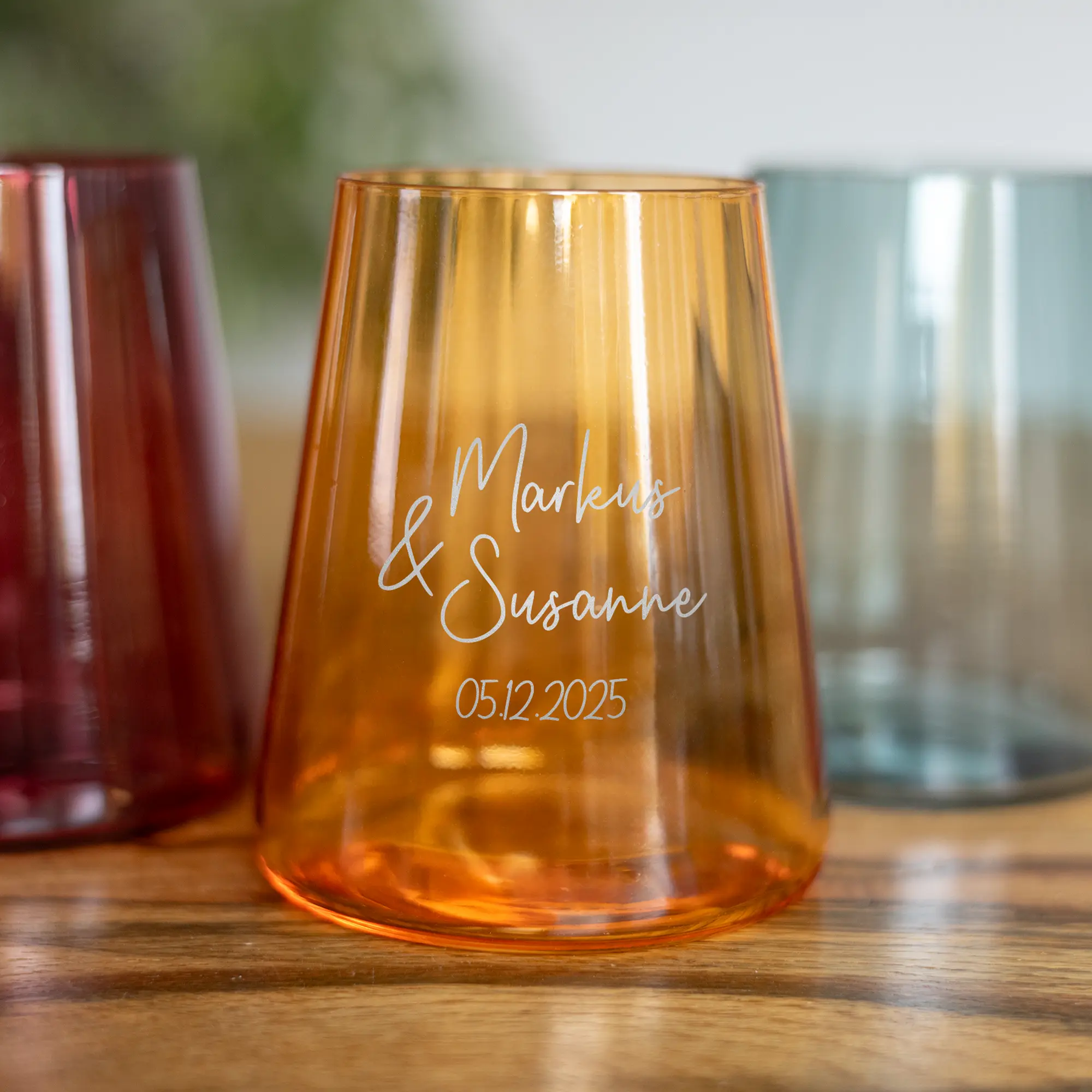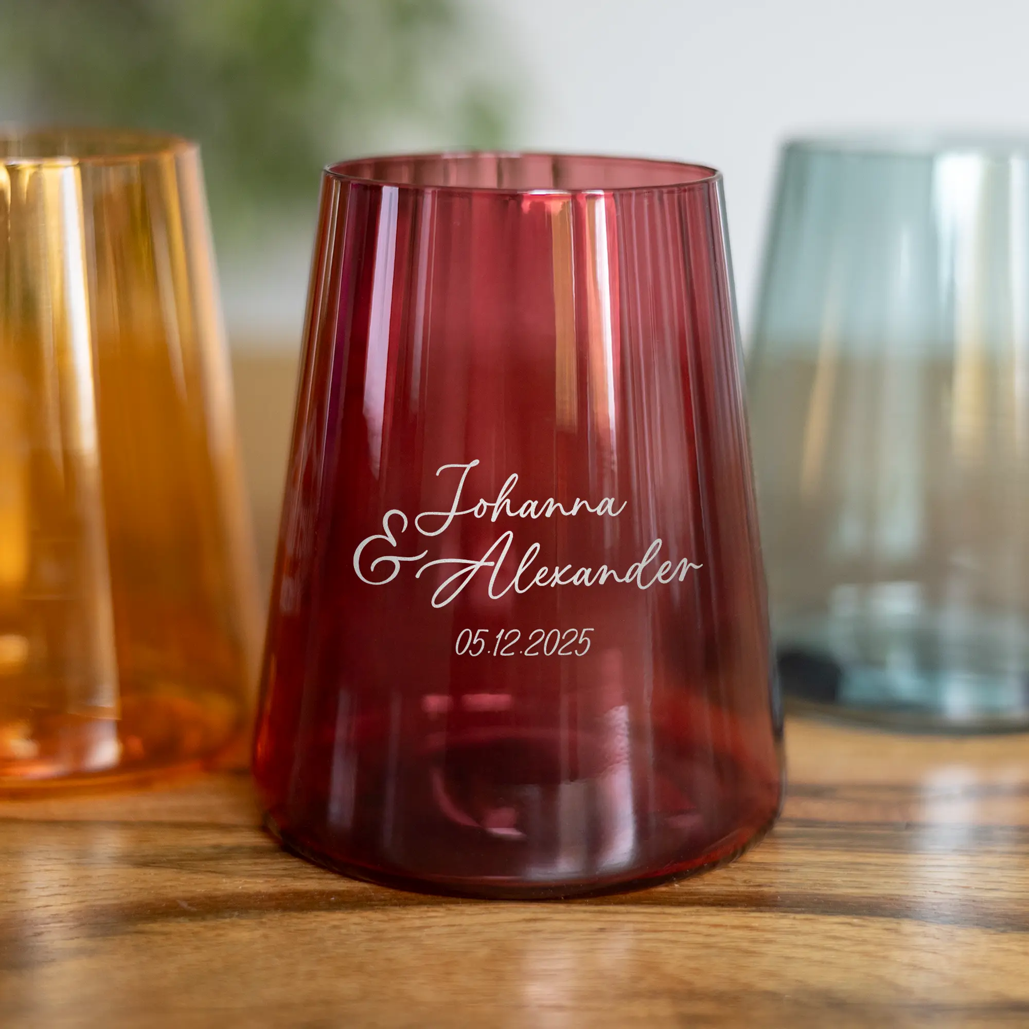 Unsere personalisierten Gläser für Paare sind eine besondere Geschenkidee für Freunde und Familie – ideal zur Verlobung, Hochzeit oder zu anderen bedeutenden Momenten, die eure gemeinsame Geschichte feiern. Erhältlich in drei modernen Trendfarben, werden die Gläser individuell mit euren Wunschnamen – euren eigenen oder denen des beschenkten Paares – sowie dem Hochzeitsdatum oder Jahrestag gestaltet. Die Namen werden mithilfe einer hochwertigen Lasergravur präzise auf das Glas aufgebracht. Gefertigt aus bleifreiem Kristallglas und mit einem Fassungsvermögen von 400 ml eignen sich die Trinkgläser perfekt für verschiedenste Kaltgetränke, die ihr gemeinsam genießen könnt. Dank unterschiedlicher Schriftarten und Farbvarianten entstehen zahlreiche Gestaltungsmöglichkeiten, die jedes Glas zu einem echten Unikat machen. Damit sind sie ein persönliches und stilvolles Geschenk für befreundete Paare, Eltern, Großeltern – oder auch für euch selbst.