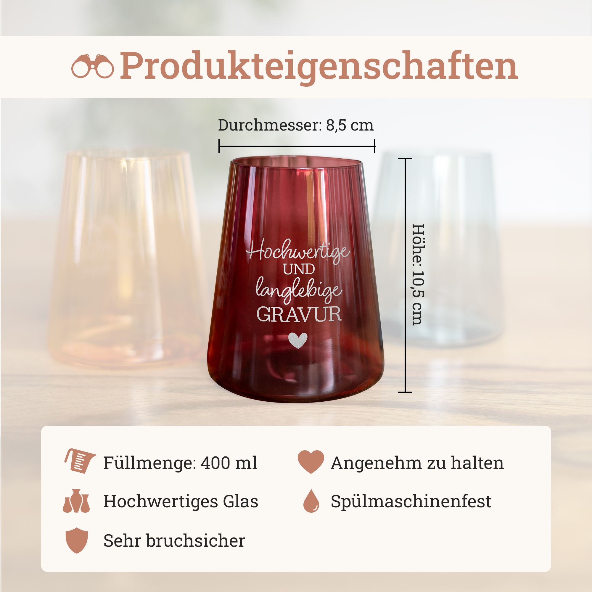 Bei der Gestaltung der Gläser aus hochwertigem Kristallglas stehen euch die drei Trendfarben Orange, Bordeauxrot und Blaugrün sowie 15 verschiedene Schriftarten zur Auswahl. Bei der Gravur werden eure beiden Namen gemeinsam mit eurem Wunschdatum in der von euch gewählten Farbe auf die Gläser eingraviert. Das Ergebnis ist ein einfaches, aber dennoch filigranes Design, das euch und eure Liebe präsentiert. Weitere Wünsche bezüglich Positionierung und individueller Gestaltung könnt ihr uns nach der Bestellung per E-Mail mitteilen. Aufgrund der vielen Auswahl- und Gestaltungsmöglichkeiten sind die Trinkgläser optimale Geschenkideen für Geburtstage, Hochzeiten, Weihnachten oder andere besondere Anlässe, an denen ihr anderen eine persönliche Freude machen möchtet. Auch für Weinliebhaber sind die Gläser perfekt, da sie durch ihre Form und Füllmenge optimale Weißweinbecher sind.