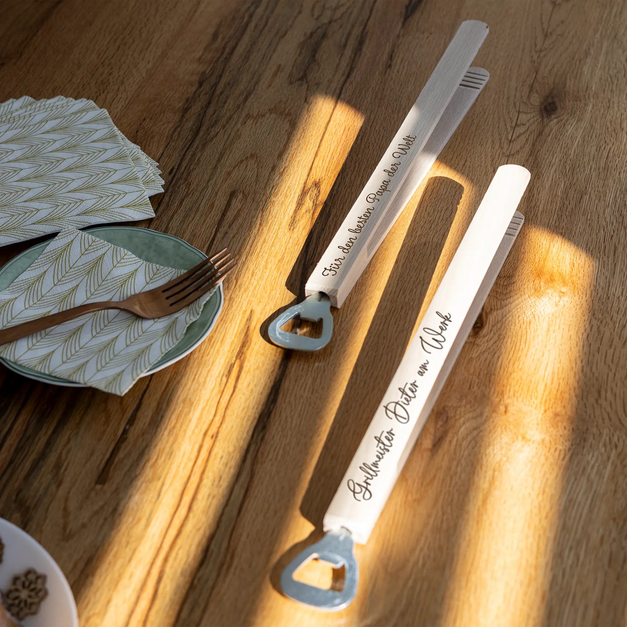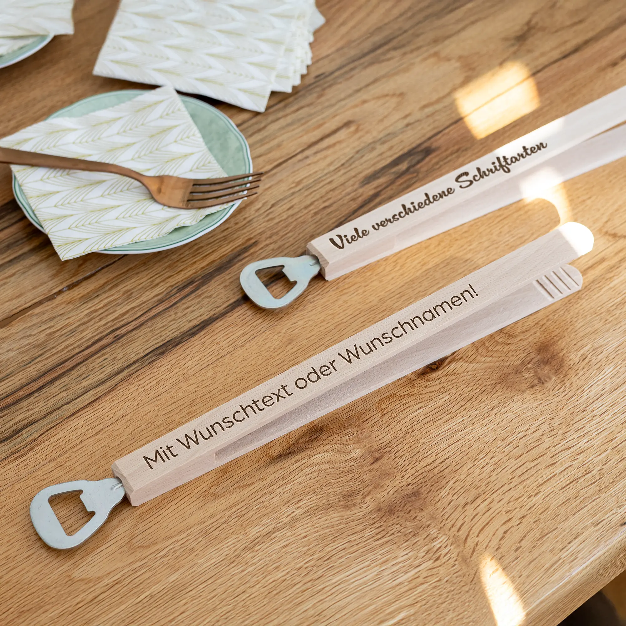 Grillzange mit eingraviertem Wunschtext und Flaschenöffner für Grillmeister