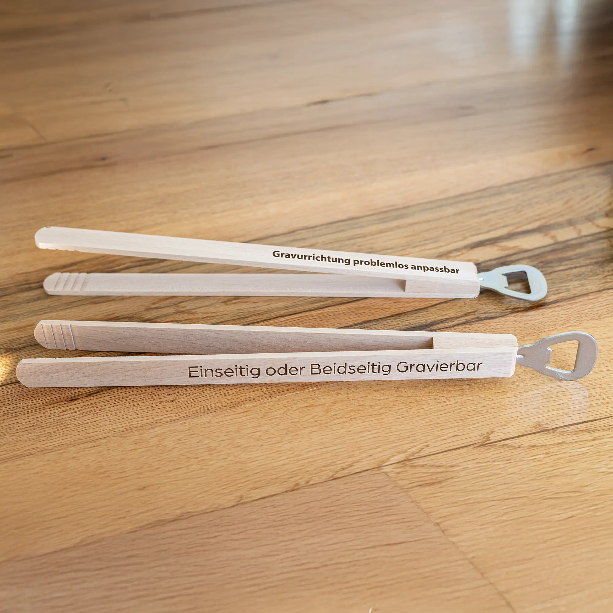 Mit unseren personalisierten Grillzangen mit Flaschenöffner könnt ihr euren Grillmeistern oder Grillmeisterinnen ein kleines aber persönliches Geschenk machen. Denn neben der robusten Grillzange aus stabilem Holz und dem eingebauten Flaschenöffner für die Lieblingsgetränke beim Grillen, habt ihr die Möglichkeit diese mit euren Wunschtexten auf einer oder beiden Seiten der Grillzange noch einmal zu personalisieren. Sei des der Name der beschenkten Person, ein netter Grillspruch, oder was euch eben einfällt. Bis auf die Fläche der Grillzange sind euch kaum Grenzen gesetzt! Der Flaschenöffner auf der Rückseite ist aus Edelstahl und bietet die Möglichkeit schnell und einfach beim Grillen Flaschen des Lieblingsgetränks oder für eure Gäste zu öffnen. Bei der Gravur eures Wunschtextes habt ihr die Auswahl zwischen vielen unterschiedlichen Schriftarten, welche ihr auf Anfrage auch gerne miteinander kombinieren könnt. Dadurch erhaltet ihr eine persönliche Grillzange, individuell nach euren Wünschen angepasst. Durch die edle und feine Gravur auf dem hellen Holz entsteht dadurch eine Grillzange die eurem Meister oder Meisterin des Grills ein Lächeln auf das Gesicht zaubern wird. Perfekt für jede Grillfeier, oder als Geschenk zum Geburtstag oder Vatertag!