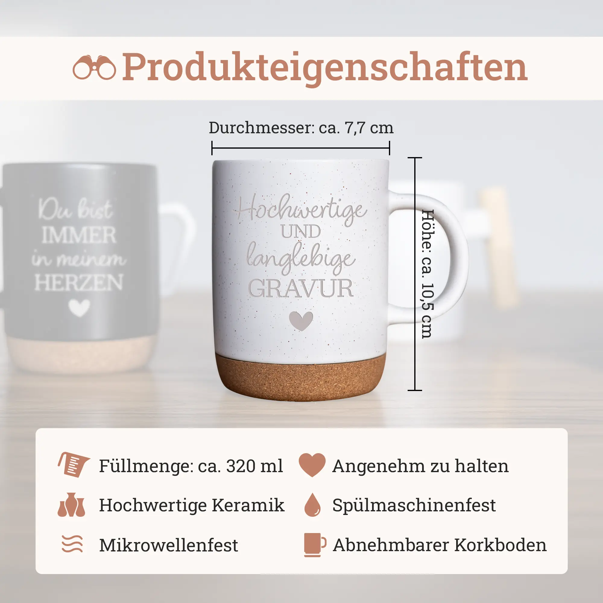 Mit dieser personalisierten Keramiktasse habt ihr die Möglichkeit, euren Lieblingsmenschen ein ganz besonderes Geschenk zu machen und ihnen zu zeigen, wie gern ihr sie habt. Gemeinsam mit dem schönen Schriftzug „Lieblingsmensch“ wird der Name eurer Liebsten zusammen mit einem kleinen Herz auf die Tasse graviert, wodurch sie zu einem besonderen Unikat wird. Die Tasse eignet sich perfekt als Geschenk für eure ganz besonderen Freunde oder Verwandte, die euch sehr nahe stehen. Mit ihr könnt ihr ihnen eine einzigartige und persönliche Aufmerksamkeit schenken. Die Tasse hat zudem ein Fassungsvermögen von ca. 320 ml und eignet sich somit perfekt für Kaffee, Tee und andere Heißgetränke. Dank des abnehmbaren Korkbodens werden klassische Untersetzer überflüssig und die Tasse kann bedenkenlos überall abgestellt werden. Auch beim Spülen der Tasse ist der abnehmbare Boden sehr praktisch. Verschenkt diese ganz persönliche Tasse an eure Lieblingsmenschen zu einem besonderen Anlass wie Geburtstag oder Weihnachten – oder einfach als Aufmerksamkeit, um diesen Menschen eine Freude zu machen.