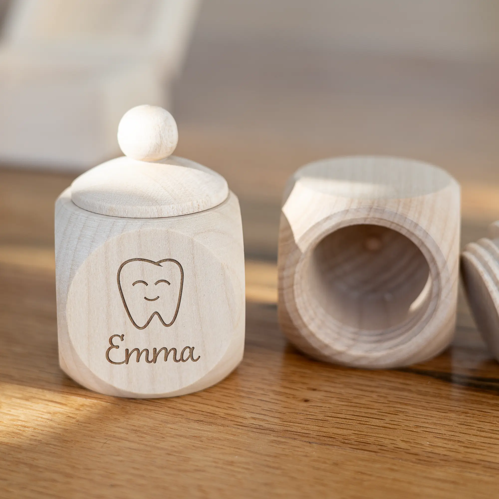 Mit unseren personalisierten Milchzahndosen aus stabilem und naturbelassenem Holz könnt ihr die Milchzähne sicher und für eine sehr lange Zeit in einer Dose mit niedlichem Motiv aufbewahren. Durch den einfachen Schraubverschluss kann die Dose schnell und einfach geöffnet und sicher wieder verschlossen werden, wodurch keine Milchzähne verloren gehen! Zudem habt ihr die Möglichkeit, die Namen eurer Kinder, Patenkinder oder auch Enkelkinder mit einem süßen Zahnmotiv auf eine der 4 Seiten der Milchzahndose gravieren und damit ganz individuell gestalten zu lassen. Durch die klare Gravur und das edle Holz entsteht eine langlebige, aber auch schöne Milchzahndose, welche euch und eure Kinder begleitet, während die Zahnfee Zahn für Zahn von euren Kindern an sich nimmt. Auch perfekt als kleines Geschenk für Eltern, deren Kind die ersten Milchzähne verliert, oder als kleines Geschenk zur Geburt!