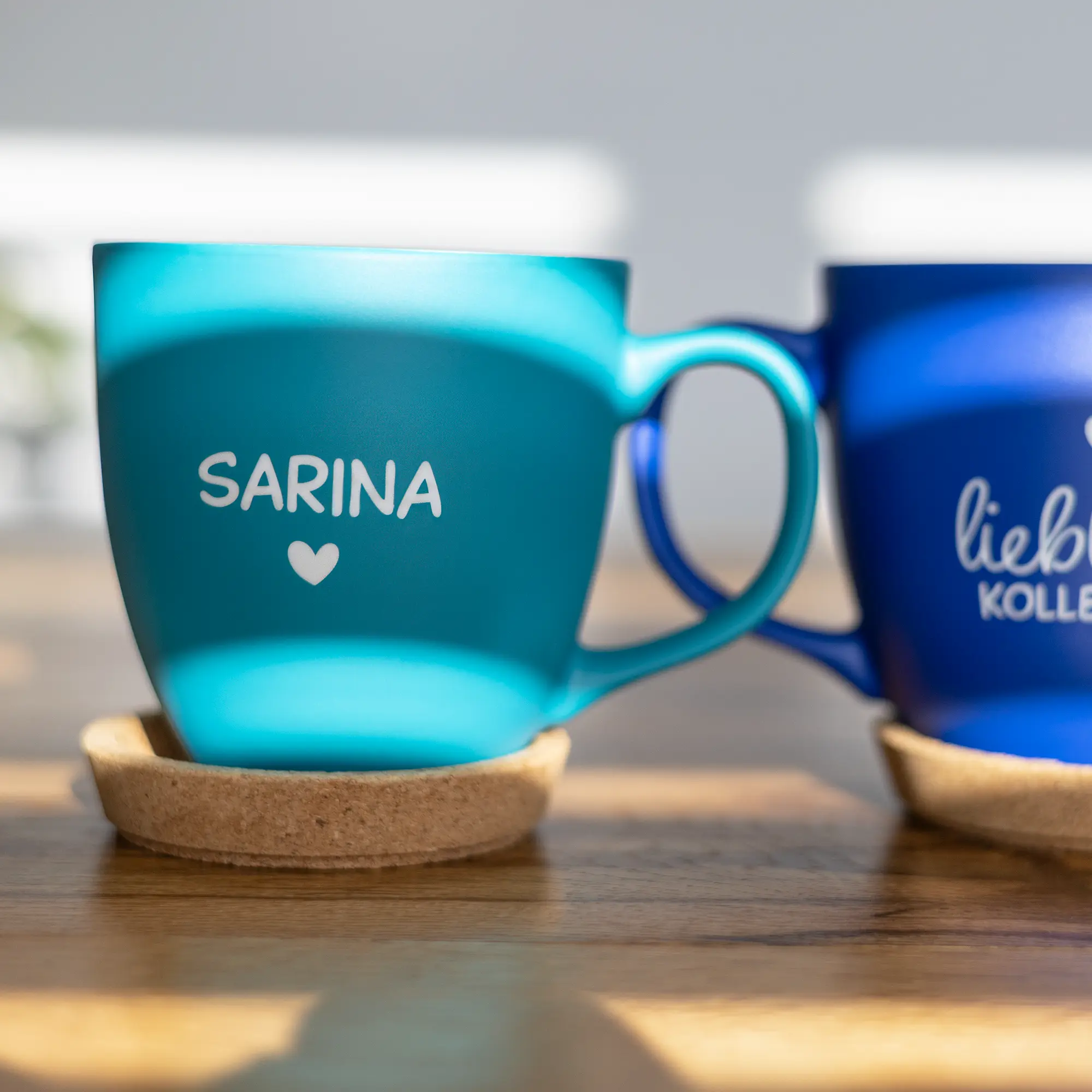 Bei der Gestaltung eurer Tasse aus Porzellan habt die Auswahlmöglichkeit aus den Farben Blau, Grün, Grau, Lila, Pink (Matt oder Glänzend), Türkis und Schwarz frei zu wählen. Des Weiteren habt ihr die Möglichkeit auf der Rückseite der Tasse eine Nachricht, Namen oder eine kleine Botschaft eingravieren zu lassen. Somit könnt ihr für eure liebsten Kolleginnen und Kollegen diese Tasse in deren Lieblingsfarbe und einer ganz persönlichen Nachricht holen, wodurch es auch zu einem tollen Geschenk für Geburtstage oder auch Firmenjubiläen oder ganz persönlichen Meilensteinen auf der Arbeit wird. Macht ihnen eine besondere Freude mit dieser schönen und großen Tasse – Egal ob für Kaffee, Tee, Kakao oder andere besondere Getränke!