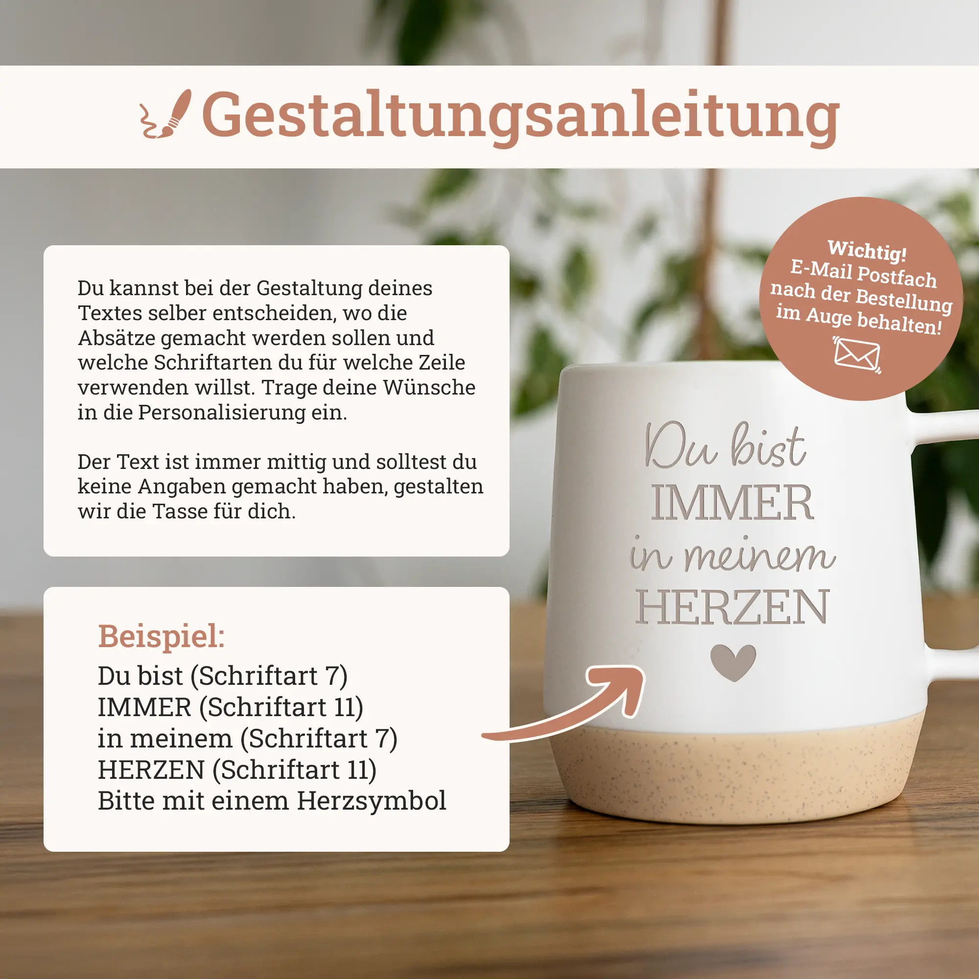 Die personalisierte Tasse, graviert mit eurem Wunschtext, ist eine kreative und persönliche Geschenkidee für Freunde, Verwandte oder auch einfach für euch selbst. Euer Text als Spruch, Zitat, Botschaft oder anderer kreativer oder auch einfacher Text, wird mittels Lasergravur präzise in die Keramiktasse eingraviert und macht jede Tasse zu einem besonderen Unikat. Bei der Gestaltung der Tasse sind auch wenig Grenzen gesetzt, somit könnt ihr auch die verschiedenen Schriftarten ganz einfach miteinander kombinieren oder wir übernehmen die Gestaltung auf Anfrage für euch. Die Tasse hat ein Fassungsvermögen von 300 ml und hat einen unglasierten Boden, welcher der Tasse einen schönen Kontrast und auch rustikalen Charakter verleiht. Durch die vielen Gestaltungsmöglichkeiten für eure individuelle Keramiktasse ist sie die optimale Geschenkidee zu jedem Anlass, wie zum Geburtstag, zu Weihnachten, zu Ostern oder einfach um anderen eine persönliche Freude zu machen.