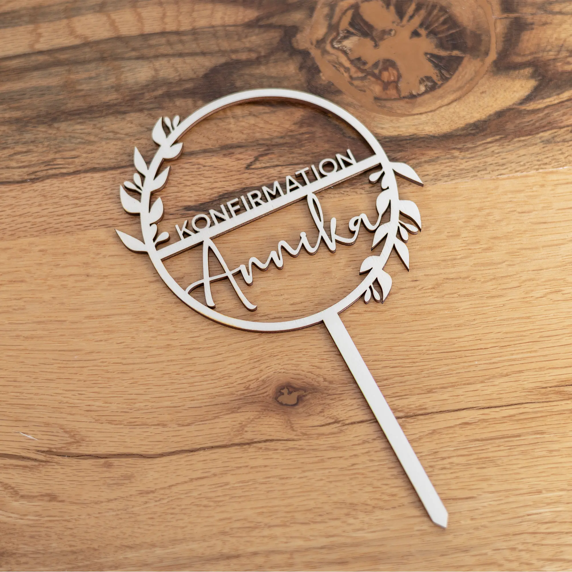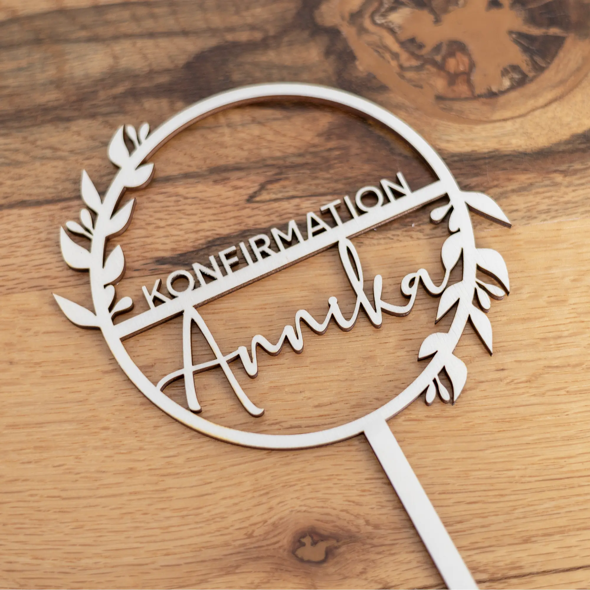 Innerhalb des Blätterkranzes des Caketoppers wird der Schriftzug „Konfirmation“ in einer einfachen Schrift oberhalb des Steges mittels sauberem Lasercut ausgeschnitten. Abgerundet wird der Caketopper durch den Namen des Konfirmanden oder der Konfirmandin in einer geschwungenen und filigranen Schrift, wodurch der Kuchenstecker erst seine ganz persönliche und individuelle Note erhält. Die Möglichkeiten, die der Kuchenstecker mit sich bringt, sind dabei vielseitig, da er sich auf Torten, Kuchen und anderen Gebäcken ganz einfach einstecken lässt. Des Weiteren kann der Caketopper auch wunderbar mit Trockenblumen oder anderen Dekorationselementen ergänzt werden. Zudem habt ihr die Möglichkeit, auf Anfrage auch weitere Individualisierungen am Design von uns vornehmen zu lassen.