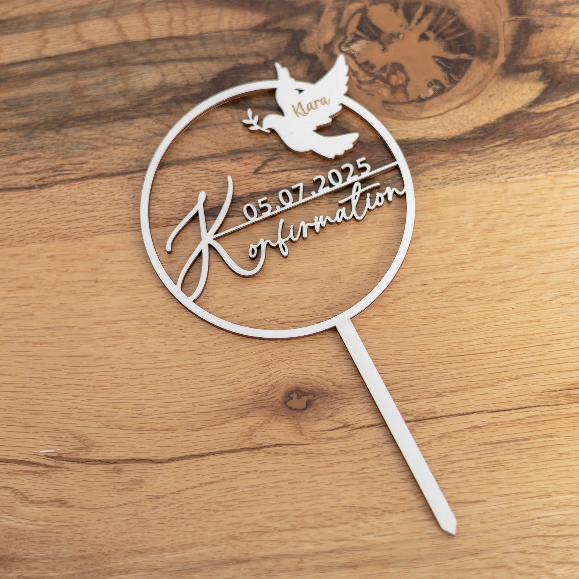 Mit dem geschwungenen Schriftzug „Konfirmation“ zusammen mit dem Datum der Konfirmation und dem bekannten Symbol der Taube mit Olivenzweig, in welches der Name des Kindes eingraviert wird erhaltet ihr einen schönen Caketopper mit filigranem Design für eure Konfirmationsfeier. Die Möglichkeiten, die der Kuchenstecker mit sich bringt sind dabei vielseitig, da er sich auf Torten, Kuchen und anderen Gebäcken ganz einfach einstecken lässt. Des Weiteren kann der Caketopper auch wunderbar mit Trockenblumen oder anderen Dekorationselementen ergänzt werden. Zudem habt ihr die Möglichkeit auf Anfrage auch weitere Individualisierungen am Design von uns vornehmen zu lassen.
