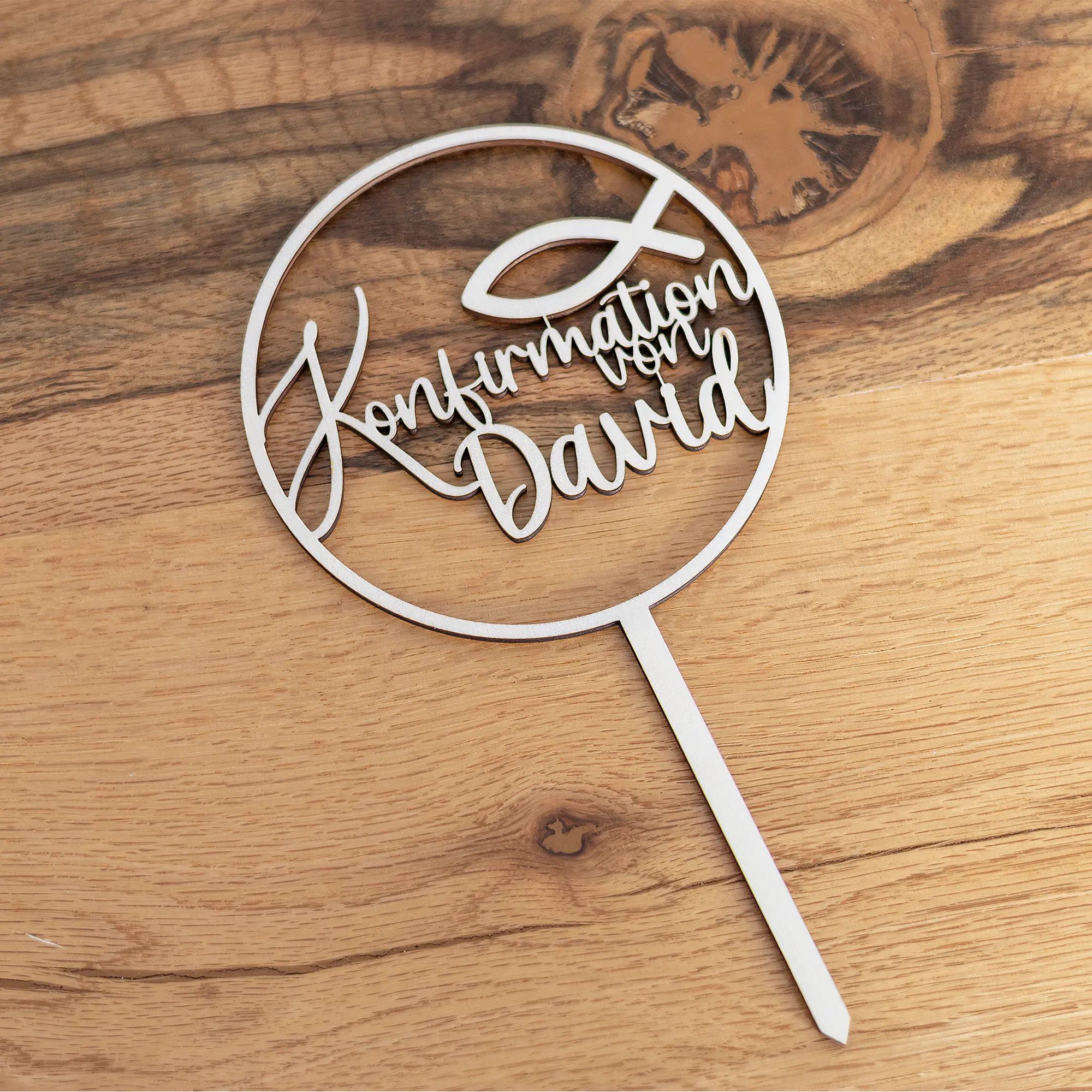 Erhältlich in drei Größen (15 cm (Motiv); 18 cm (Motiv) oder 20 cm (Motiv)), werden unsere Caketopper in sorgfältiger Handarbeit gefertigt, gelasert und verpackt. Da es sich um ein Naturprodukt handelt, können Maserung und Farbe variieren, was jeden Kuchenstecker zu einem Unikat macht. Entdeckt in unserem Shop auch weitere personalisierte Geschenke zur Konfirmation, wie unsere Tischkarten, Geldgeschenke oder Caketopper. Macht die Konfirmation zu einem unvergesslichen Ereignis mit einem Caketopper, der auch nach der Feier lange Freude bereitet.