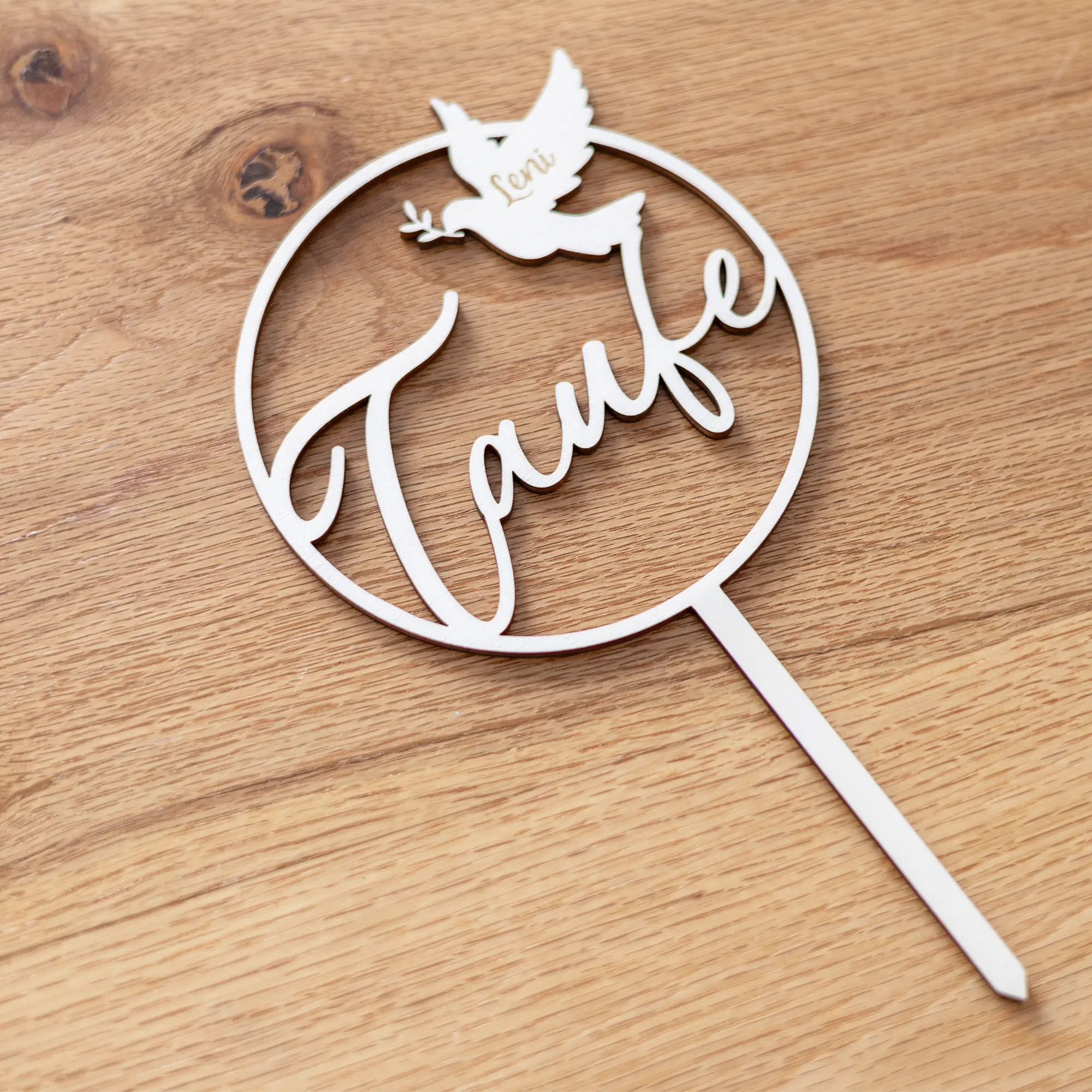 Mit dem großen und geschwungenen Schriftzug „Taufe“ und dem bekannten Symbol der Taube, in welches der Name des Kindes eingraviert wird, entsteht ein schlichtes, aber dennoch schönes und filigranes Design für euren Caketopper zur Taufe. Die Möglichkeiten, die der Kuchenstecker mit sich bringt, sind dabei vielseitig, da er sich auf Torten, Kuchen und anderen Gebäcken ganz einfach einstecken lässt. Des Weiteren kann der Caketopper auch wunderbar mit Trockenblumen oder anderen Dekorationselementen ergänzt werden.