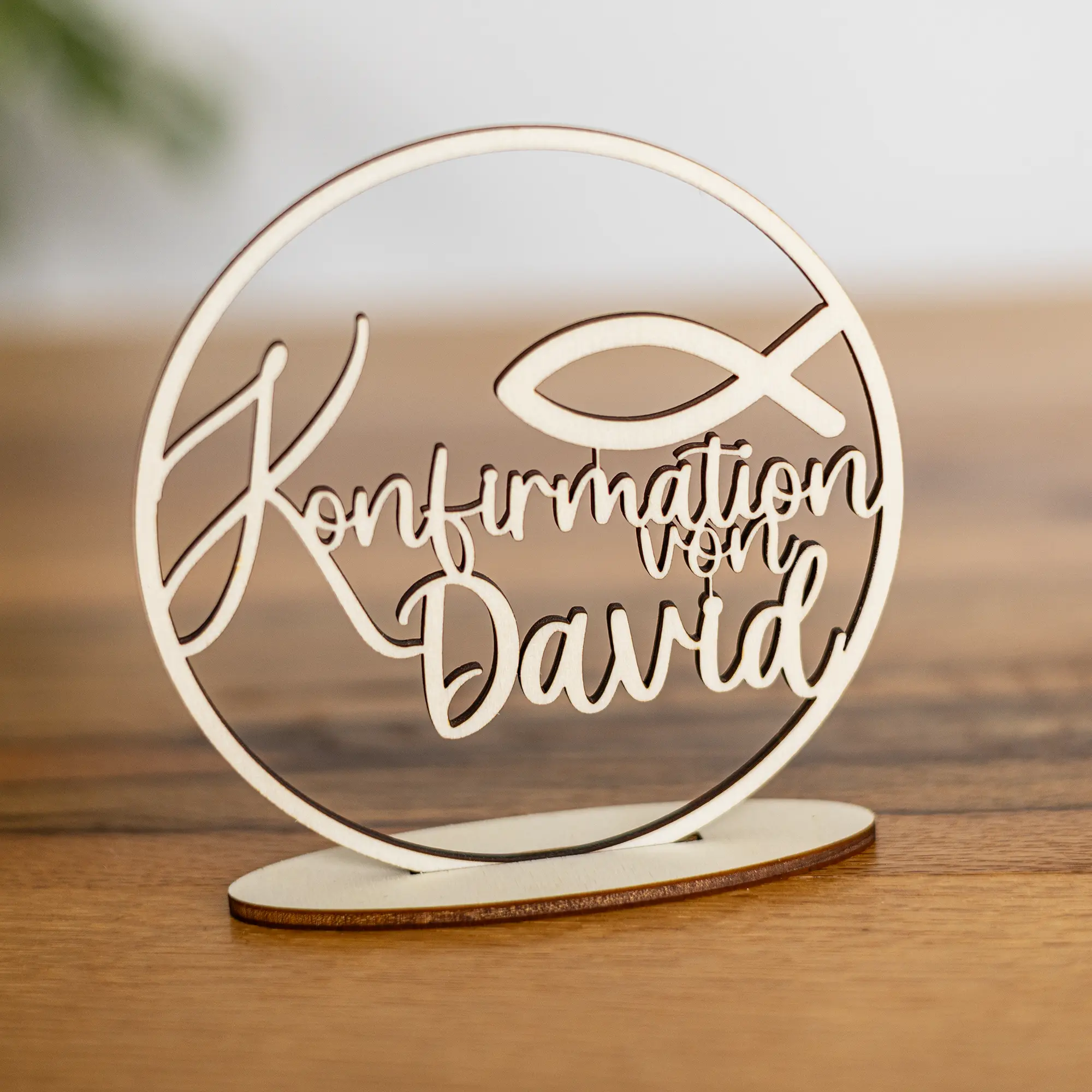 Der personalisierte Dekoring „Konfirmation von“ aus Holz mit dem bekannten Fisch-Symbol Ichthys ist ein ganz persönliches Geschenk zur Konfirmation eures Kindes, der Enkel- oder Patenkinder oder der Kinder von guten Freunden. Der Holzkranz aus robustem Birkenholz wird handgefertigt und individuell mit dem Namen eures Kindes gestaltet, wodurch auch nach dem wichtigen Tag der Konfirmation der Dekoring als bleibendes Erinnerungsstück behalten werden kann.