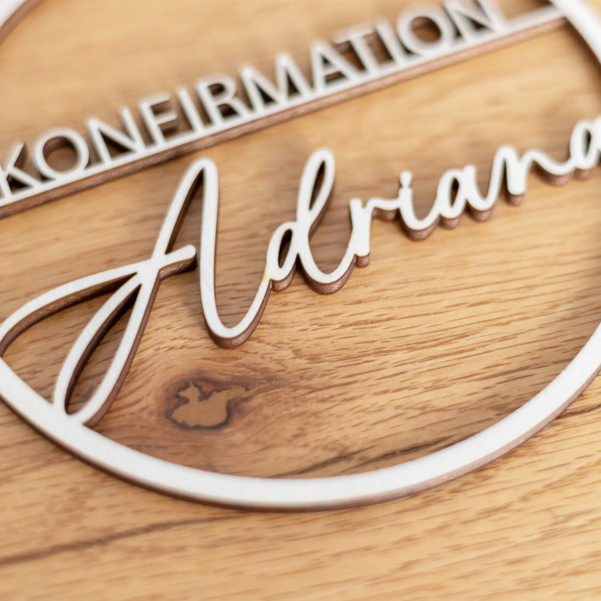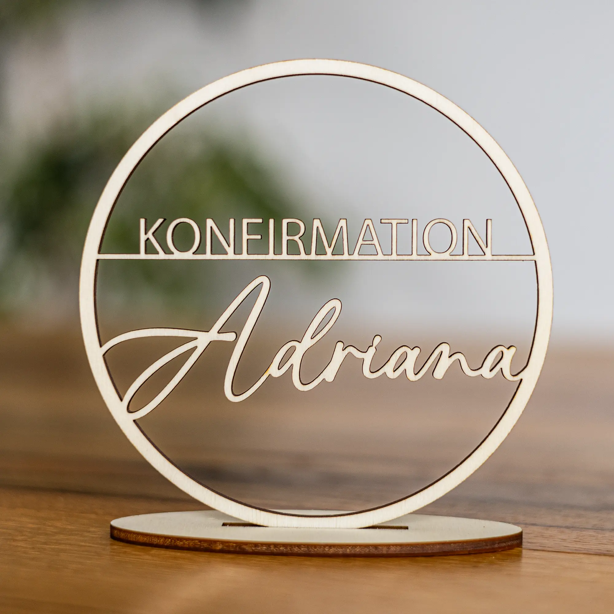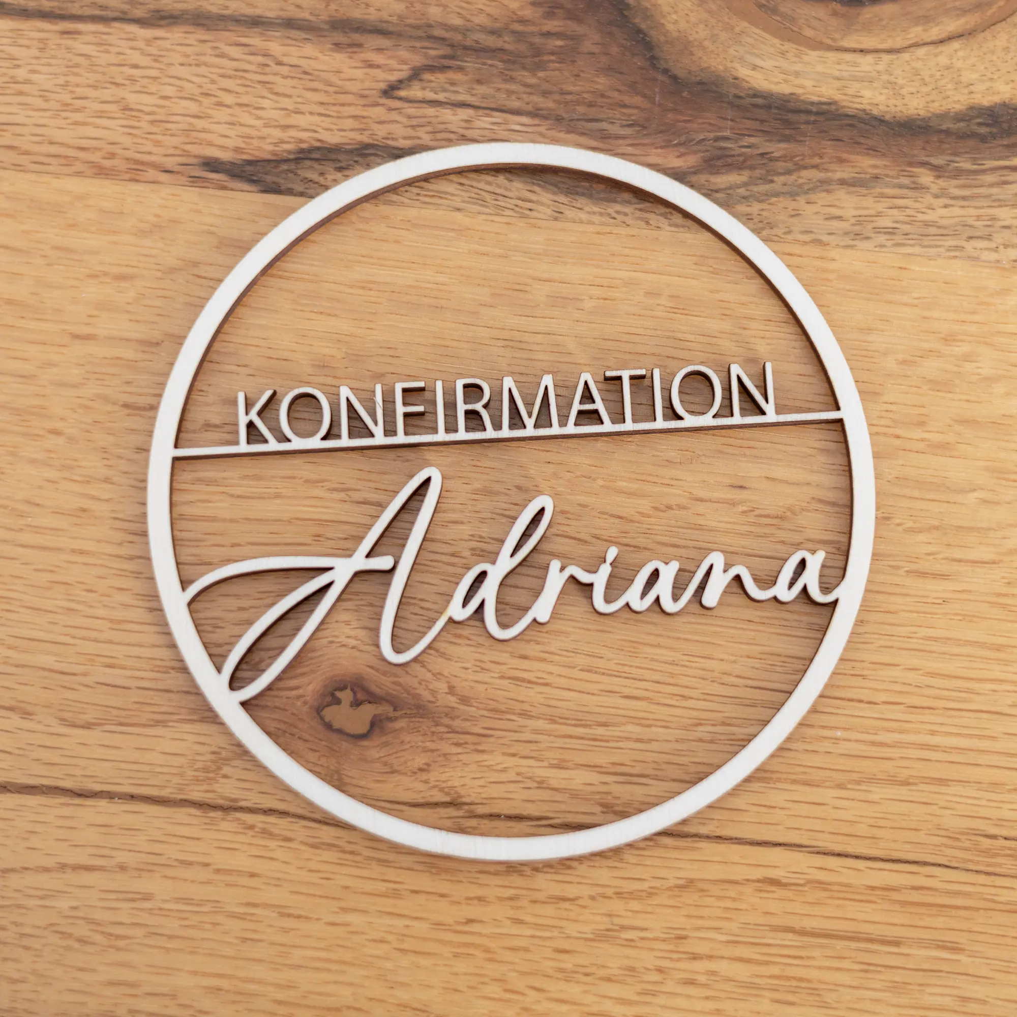 Innerhalb des Dekorings wird der Namen des Konfirmanden oder der Konfirmandin in einer geschwungenen Schrift gemeinsamen mit dem Wort „Konfirmation“ auf einem kleinen Holzsteg präzise mittels Lasercut ausgeschnitten. Hierbei überzeugt der Dekoring durch seine einfache aber dennoch filigrane Gestaltung, bei der der Name im Vordergrund steht. Dadurch entsteht ein schlichtes aber schöner Dekoring zur Konfirmation mit vielseitigen Einsatzmöglichkeiten: als Teil der Tischdekoration, als Wandschmuck oder als persönliches Namensschild für Geschenke. Er lässt sich auch wunderbar mit Trockenblumen oder anderen Elementen ergänzen. Zum Aufhängen bindet ihr einfach eine Schnur an den oberen Bereich des Ringes. Alternativ habt ihr auch die Möglichkeit einen Standfuß der Bestellung hinzuzufügen, um euren personalisierten Dekoring zur Konfirmation auch zum Beispiel auf Tische zu stellen.