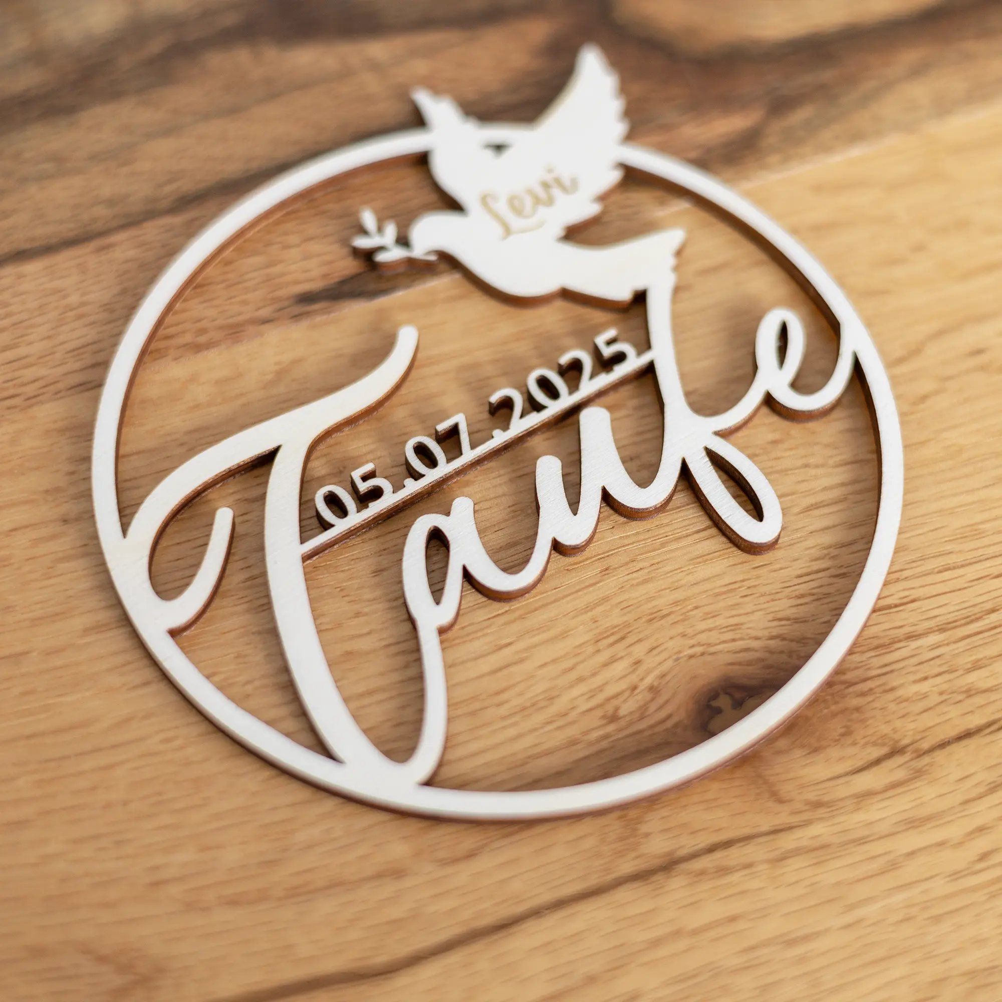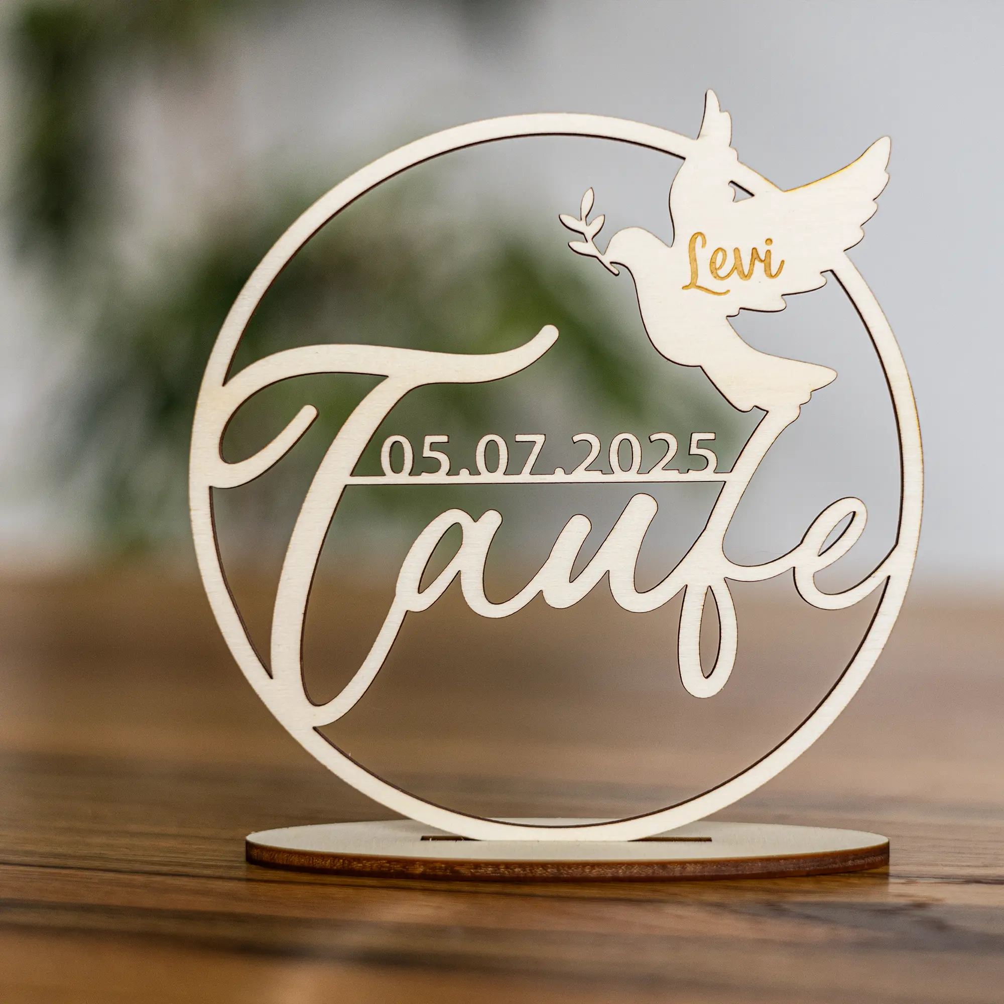Mit dem großen und geschwungenen Schriftzug „Taufe“ und dem bekannten Symbol der Taube, in welches der Name des Kindes eingraviert wird sowie dem Taufdatum, welches innerhalb des Wortes „Taufe“ mittels Laser ausgeschnitten wird, entsteht ein schlichtes, aber dennoch schönes und filigranes Design. Die Möglichkeiten, die der Dekoring für Taufgeschenke und Dekoration mit sich bringt sind dabei vielseitig: als Teil der Tischdekoration, als Wandschmuck oder als persönliches Namensschild für Geschenke sowie Geschenkkörbe. Er lässt sich auch wunderbar mit Trockenblumen oder anderen Elementen ergänzen. Zum Aufhängen bindet ihr einfach eine Schnur an den oberen Bereich des Ringes. Alternativ habt ihr auch die Möglichkeit einen Standfuß der Bestellung hinzuzufügen, um euren personalisierten Holzkranz zur Taufe auch zum Beispiel auf Tische zu stellen.