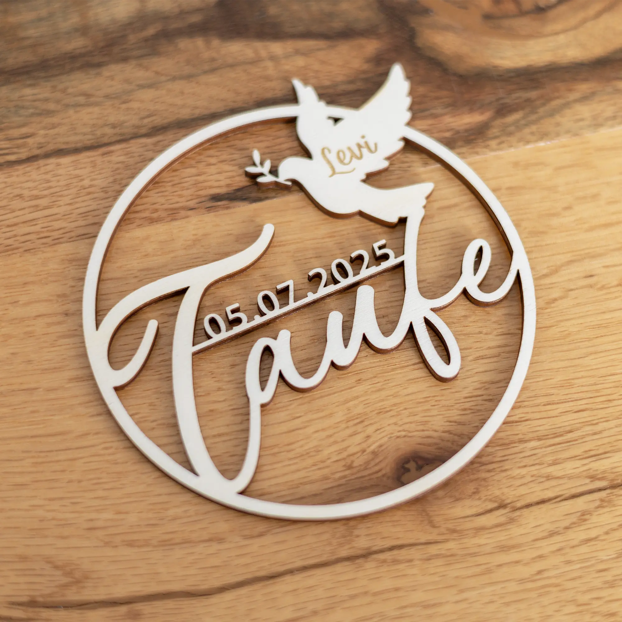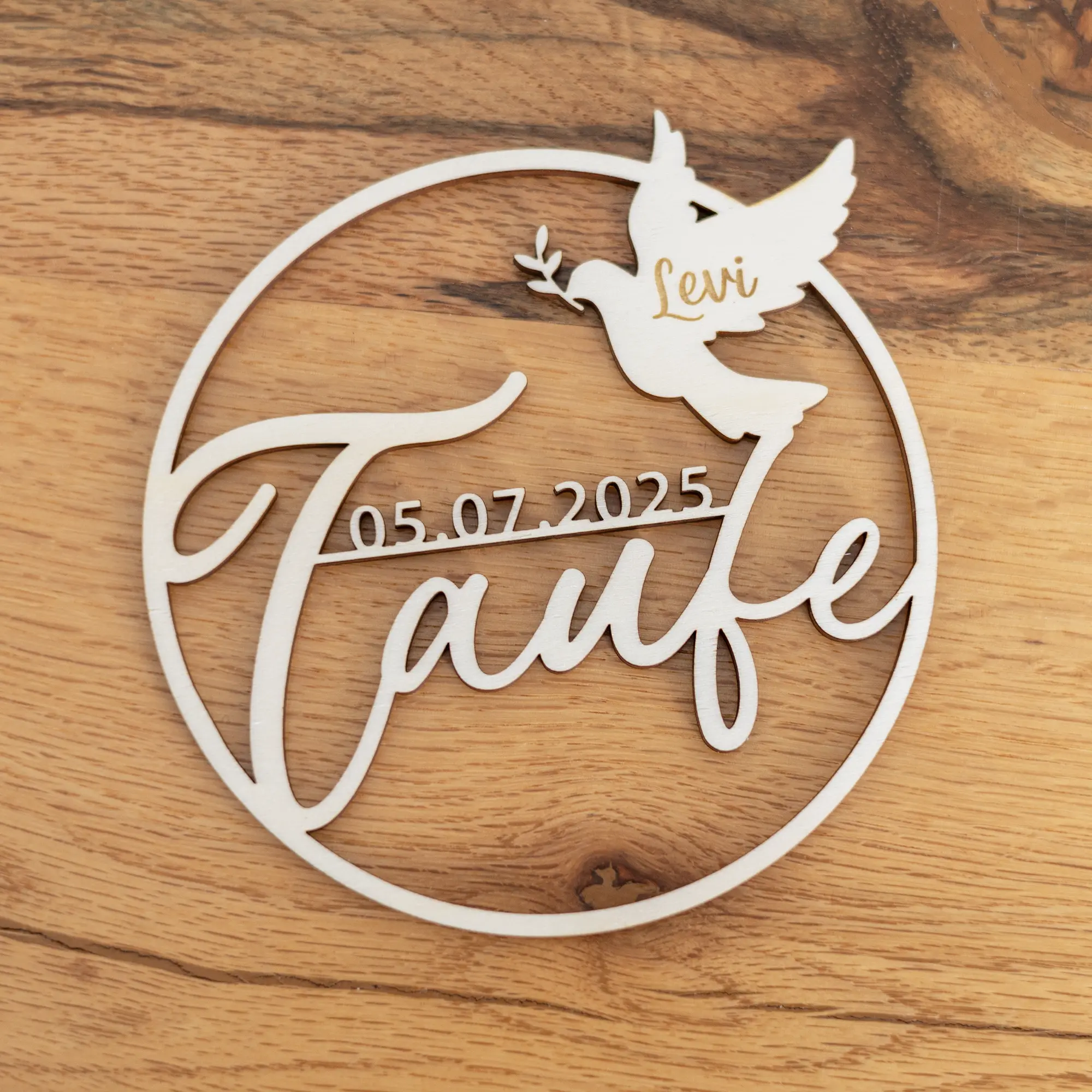 Der personalisierte Dekoring für die Taufe mit Namen und Taufdatum ist ein ganz besonderes Dekorationselement oder ein persönliches Geschenk zur Taufe eures Kindes, der Enkel- oder Patenkinder oder der Kinder von guten Freunden. Der Holzkranz aus hochwertigem Birkenholz wird individuell mit dem Namen des zu Taufenden Kindes sowie dem Taufdatum gestaltet. Abgerundet wird das ganze durch das bekannte Symbol der Taube mit Olivenzweig im Schnabel. Durch sein robustes Material und seine feine Verarbeitung ist der Dekoring auch nach den Feierlichkeiten der Taufe noch ein langlebiges Erinnerungsstück und kann im Eigenheim aufgestellt oder aufgehängt werden.