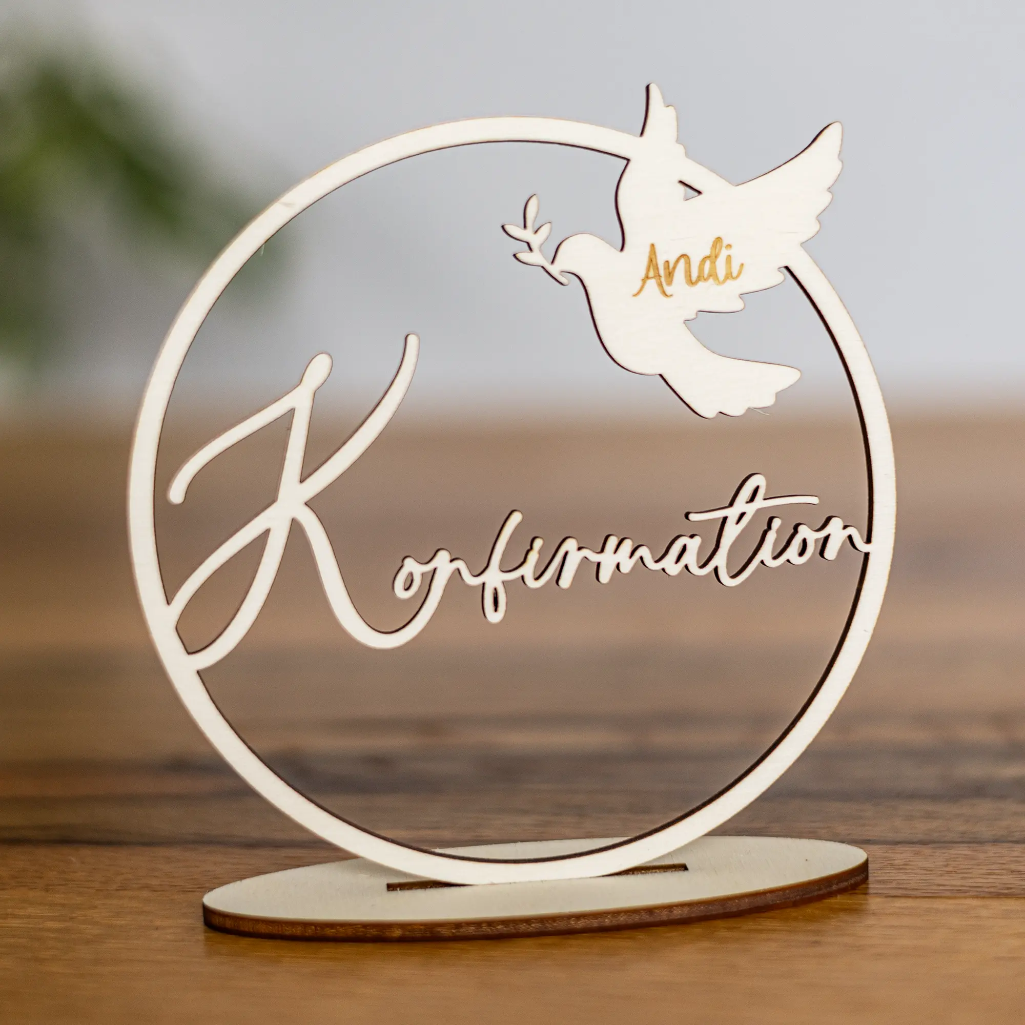 Gemeinsam mit dem geschwungenen Schriftzug „Konfirmation“ wird auch das Symbol der Taube im oberen Bereich des Dekorings präzise mittels Laser ausgeschnitten. Abgerundet und personalisiert wird der Dekoring durch den Namen des Konfirmanden oder der Konfirmandin, welcher auf der Taube eingraviert wird. Dadurch entsteht ein schlichtes, aber schönes Dekoring zur Konfirmation mit vielseitigen Einsatzmöglichkeiten: als Teil der Tischdekoration, als Wandschmuck oder als persönliches Namensschild für Geschenke. Er lässt sich auch wunderbar mit Trockenblumen oder anderen Elementen ergänzen. Zum Aufhängen bindet ihr einfach eine Schnur an den oberen Bereich des Ringes. Alternativ habt ihr auch die Möglichkeit, einen Standfuß der Bestellung hinzuzufügen, um euren personalisierten Dekoring zur Konfirmation auch zum Beispiel auf Tische zu stellen.