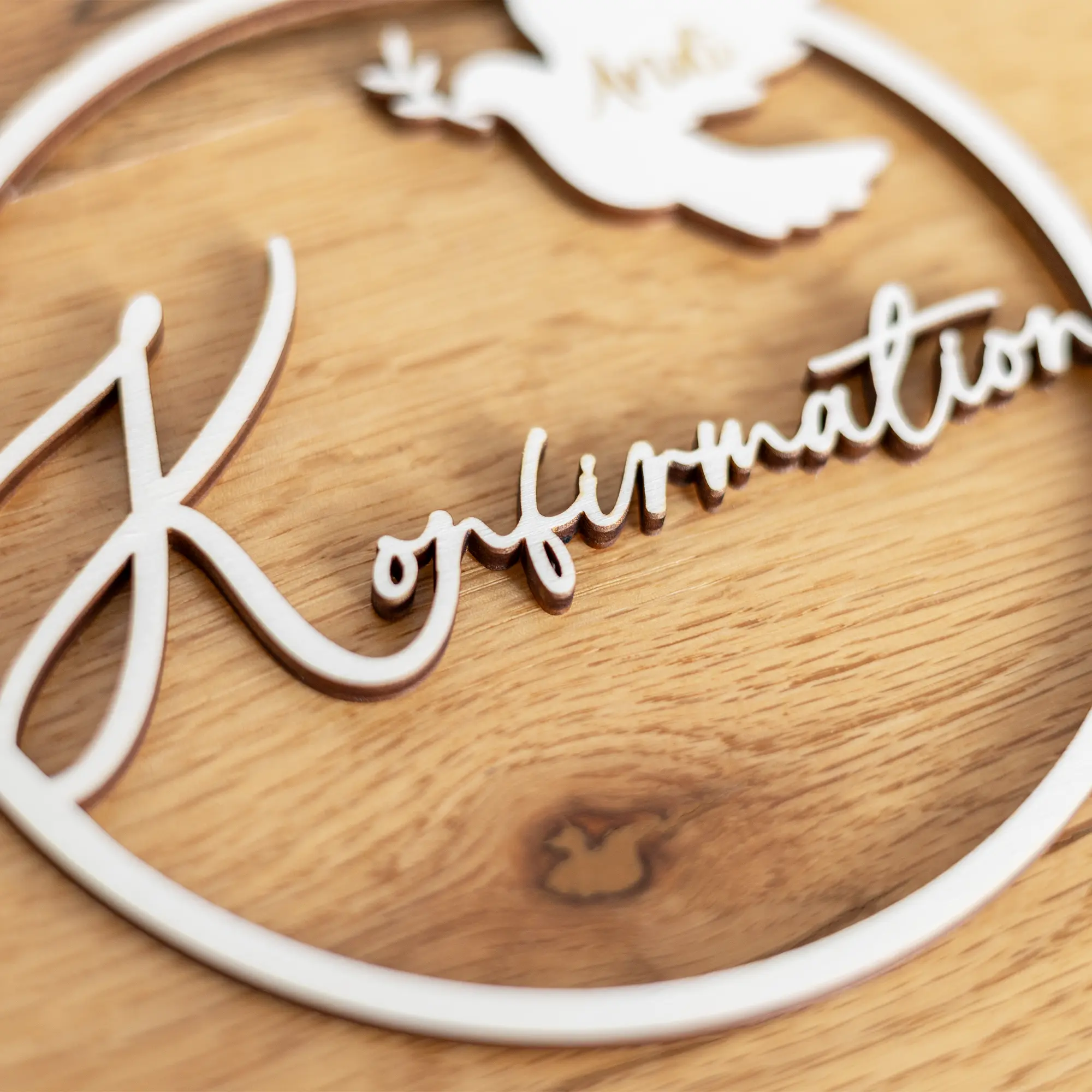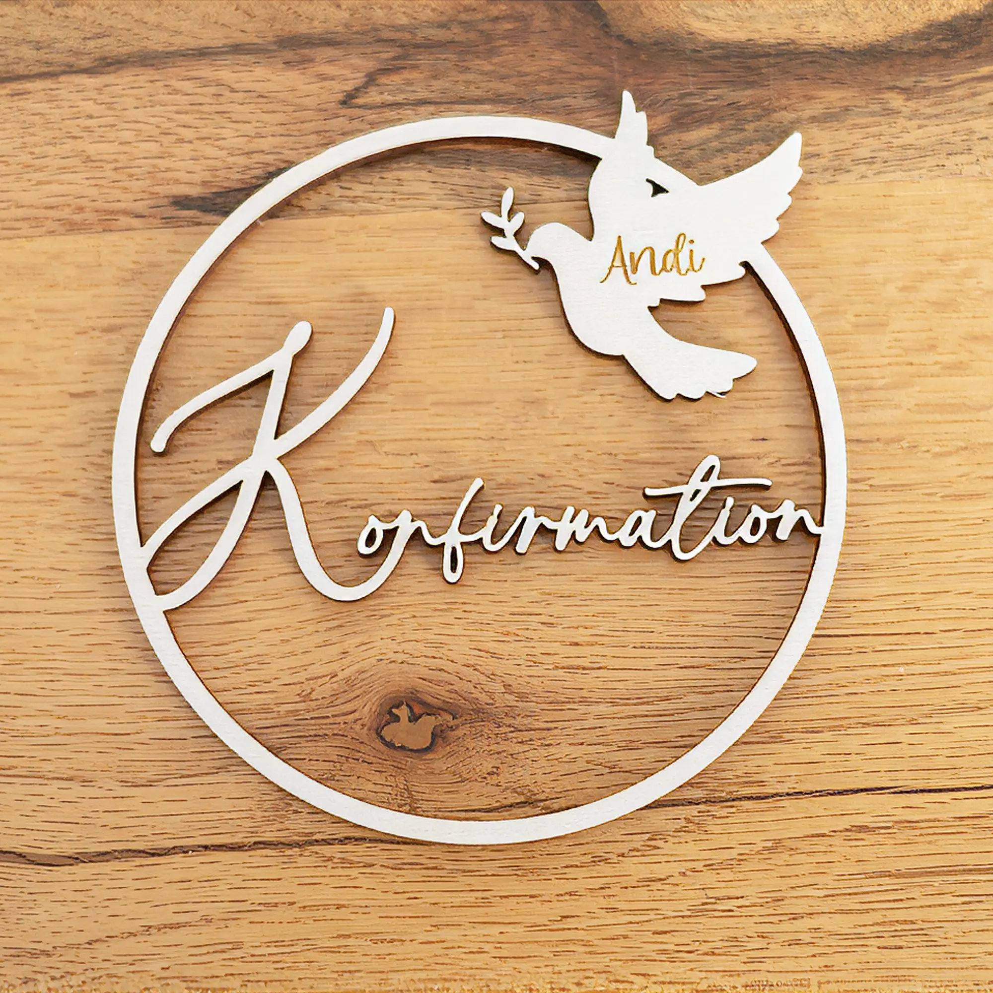 Der personalisierte Holzkranz zur Konfirmation mit dem bekannten Symbol der Taube mit Olivenzweig im Schnabel ist ein ganz besonderes Geschenk zur Konfirmation eures Kindes, der Enkel- oder Patenkinder oder der Kinder von guten Freunden. Der Dekoring wird aus robustem Birkenholz handgefertigt und mit dem Namen des Konfirmanden oder der Konfirmandin individuell gestaltet. Damit erhaltet ihr nicht nur ein ganz persönliches Dekorationsstück für die Feier oder auch Geschenke, sondern auch ein bleibendes Erinnerungsstück an den wichtigen Tag der Konfirmation, welcher ein prägender Meilenstein ist.