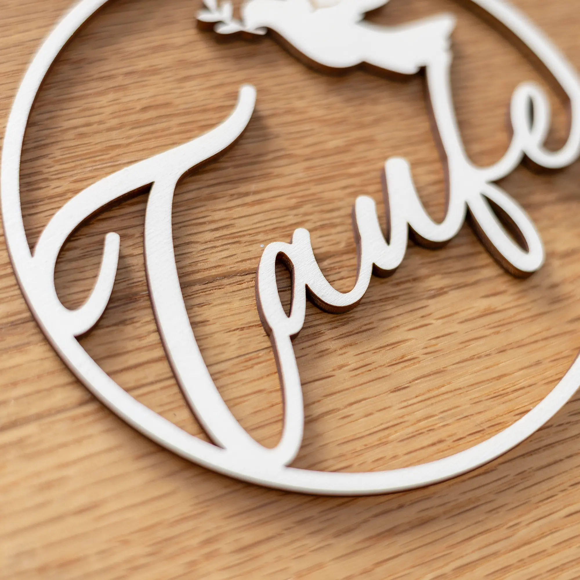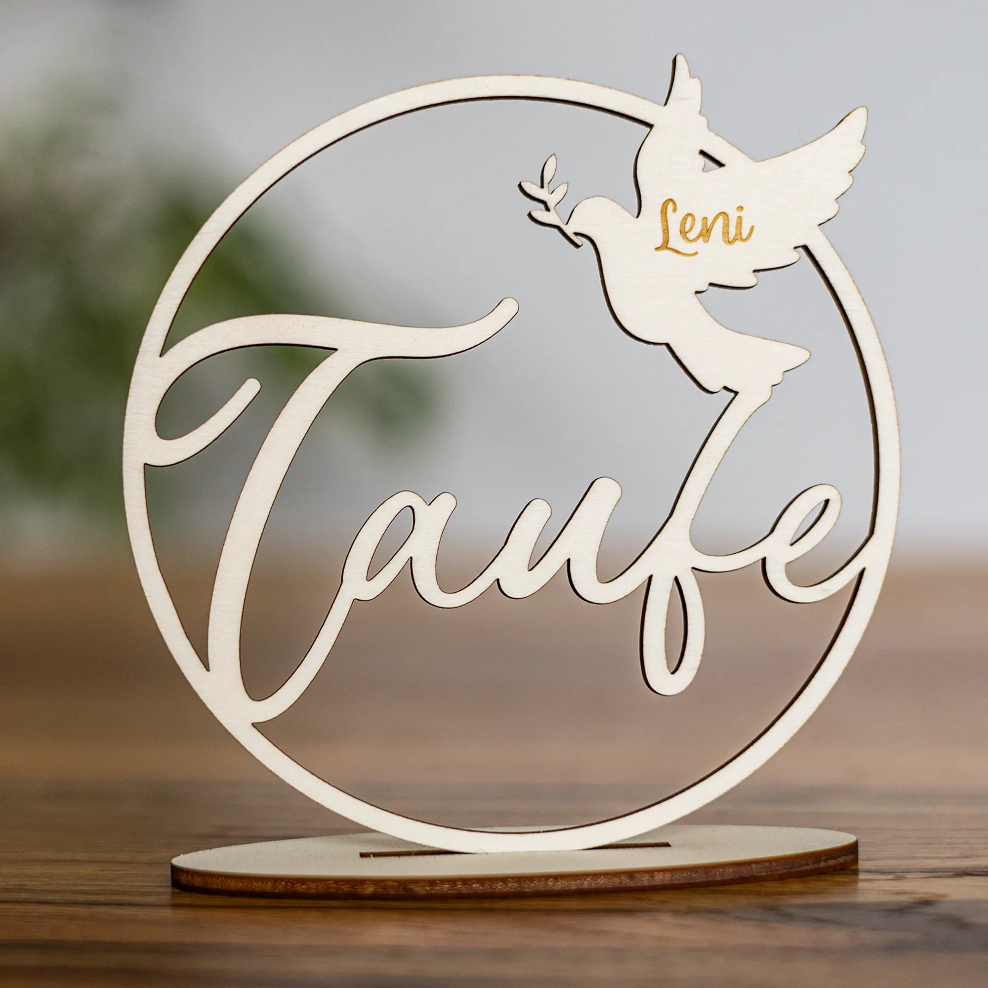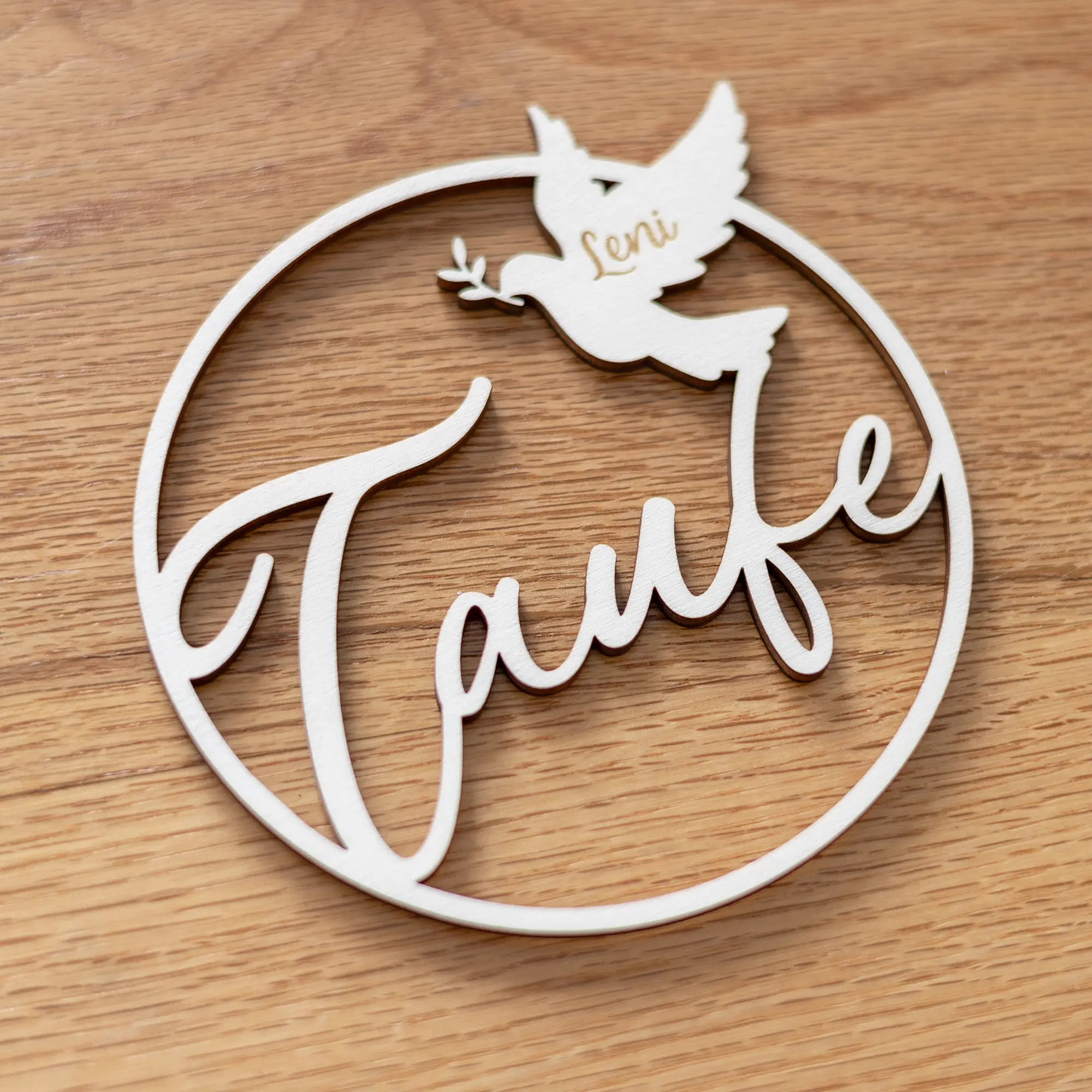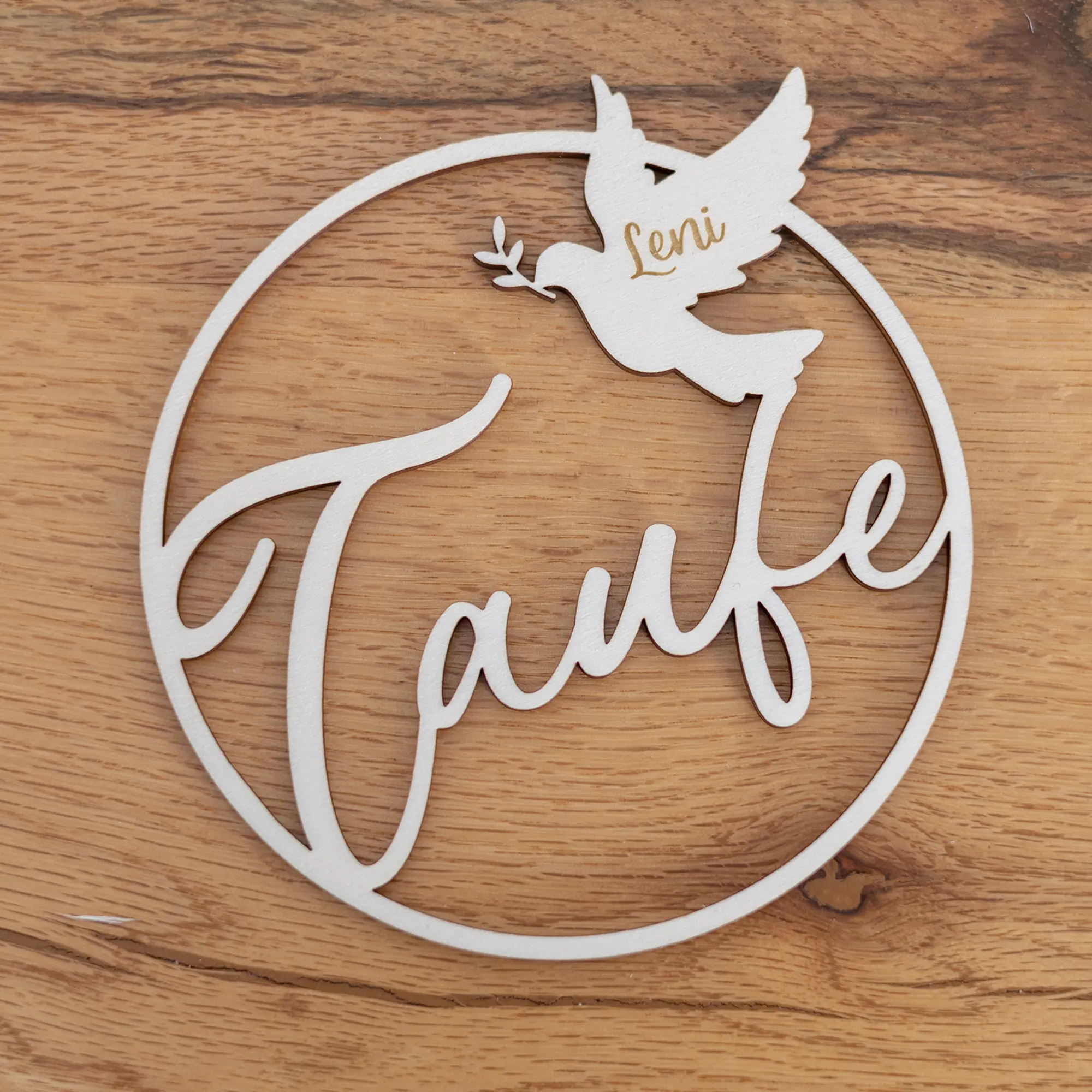 Mit dem großen und geschwungenen Schriftzug „Taufe“ und dem bekannten Symbol der Taube, in welches der Name des Kindes eingraviert wird, entsteht ein schlichtes, aber dennoch schönes und filigranes Design. Die Möglichkeiten, die der Holzkranz für Geschenke und Dekoration mit sich bringt sind dabei vielseitig: als Teil der Tischdekoration, als Wandschmuck oder als persönliches Namensschild für Geschenke. Er lässt sich auch wunderbar mit Trockenblumen oder anderen Elementen ergänzen. Zum Aufhängen bindet ihr einfach eine Schnur an den oberen Bereich des Ringes. Alternativ habt ihr auch die Möglichkeit einen Standuß der Bestellung hinzuzufügen, um euren personalisierten Dekoring zur Konfirmation auch zum Beispiel auf Tische zu stellen.