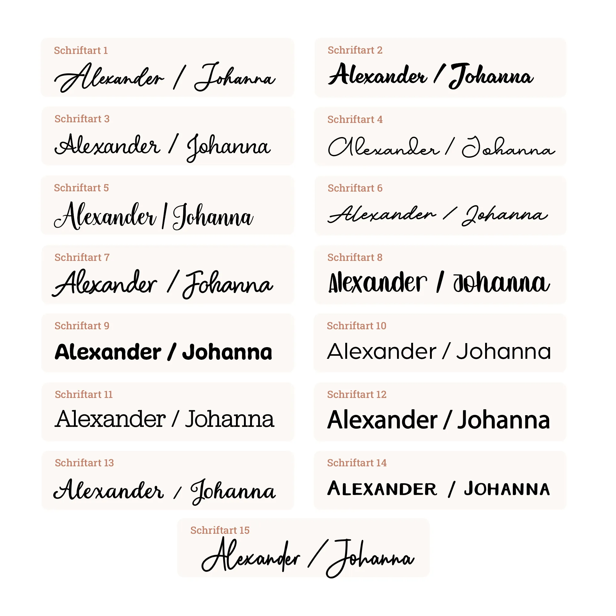 Wähle aus fünfzehn verschiedenen Schriftarten, sechs verschiedenen Designmöglichkeiten sowie 5 Farben für den Namen deiner Kinder oder lasse bei besonderen Wünschen eure personalisierte Stundenplan von uns umgestalten. Jeder Stundenplan wird in sorgfältiger Handarbeit in Deutschland hergestellt und von uns weiterverarbeitet, wodurch jedes Stück zu einem Unikat wird. Das individuelle Design machen die Stundenpläne für Schulkinder zu einem ganz besonderen Erinnerungsstück für den Meilenstein der Einschulung und für jedes weitere Schuljahr.