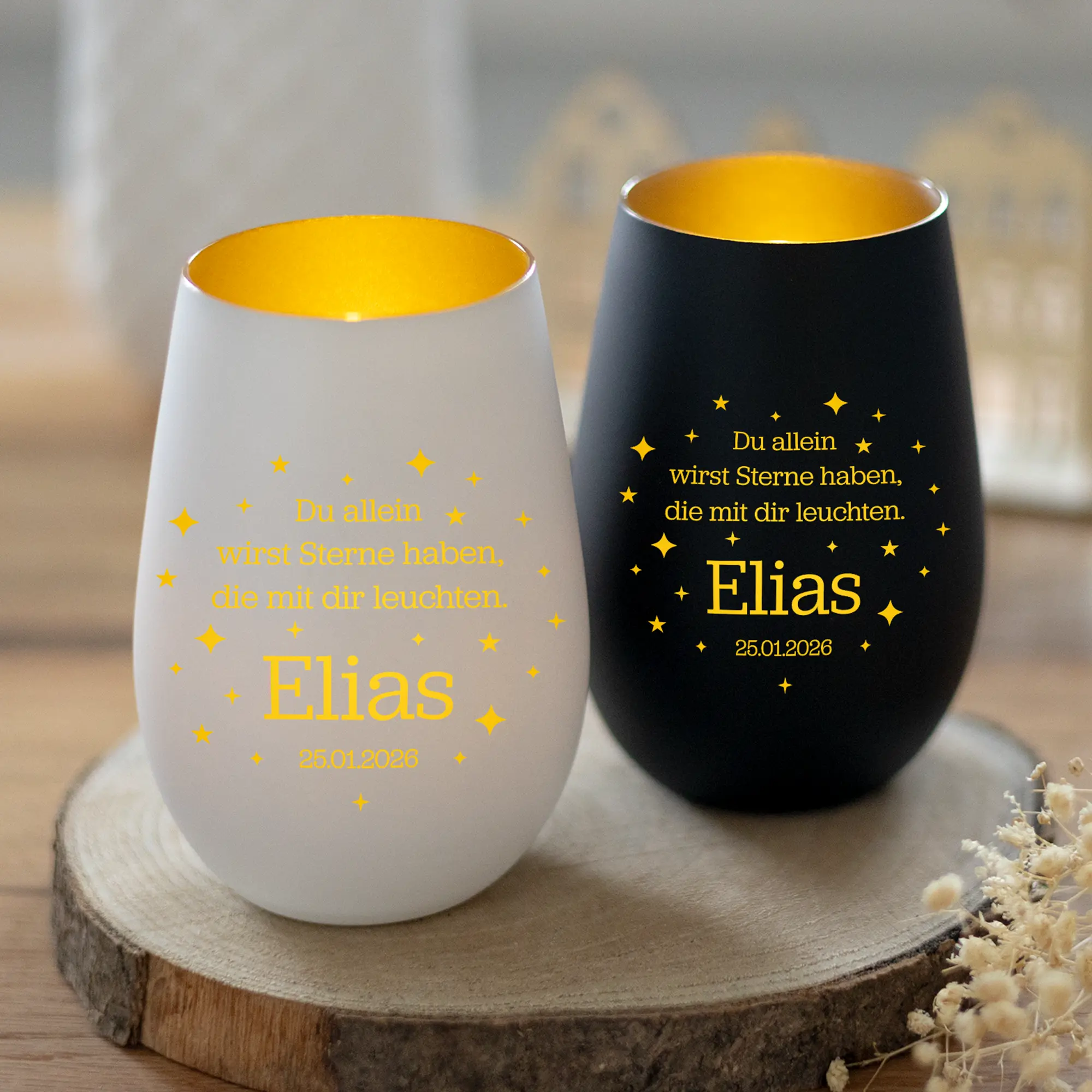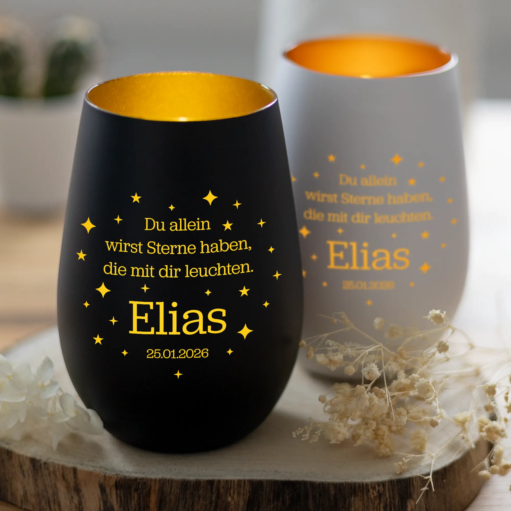 Einen geliebten Menschen zu verlieren, ist nie leicht. Umso schwerer ist es, wenn es sich dabei um ein Kind handelt, welches das Licht der Erde nur kurz oder nicht erblicken durfte. Mit unserem personalisierten Trauerlicht aus Glas habt ihr die Möglichkeit, eurem Sternenkind zu gedenken oder Freunden und Verwandten mit dem Windlicht als Trauergeschenk Trost zu spenden. Das Trauerlicht wird mit dem Namen des Sternenkindes und dem Todesdatum individualisiert. Diese werden gemeinsam mit dem Spruch „Du allein wirst Sterne haben, die mit dir leuchten” und umringt von Sternen mittels Lasergravur auf das Glas graviert. Wenn eine Kerze oder ein LED-Licht hineingestellt wird, scheint das Licht sanft durch die Gravur nach außen. Dadurch wird das Trauerlicht zu einem ganz besonderen Licht in der Dunkelheit und hilft euch bei eurer Trauer, hält aber auch die Erinnerung aufrecht.