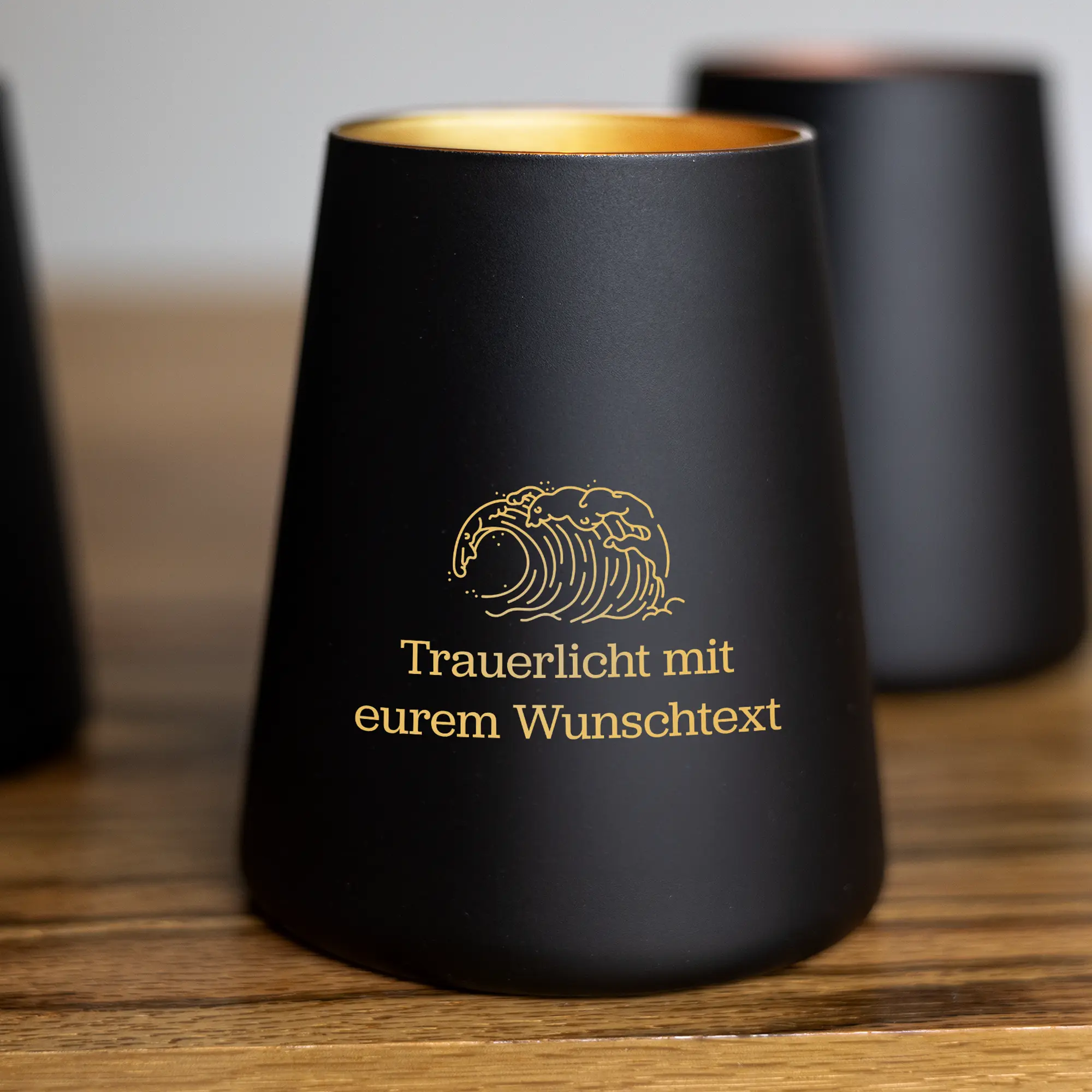 Dieses personalisierte Trauerlicht mit dem Motiv einer Welle und eurem Wunschtext ist ein optimales Andenken für alle, die die See und das Meer geliebt haben. Die Welle symbolisiert einerseits genau diese beiden Themen, andererseits steht sie auch für das „Meer des Lebens“, wobei die Wellen den unaufhaltsamen Wechsel von Leben und Sterben aufzeigen. Das Motiv der Welle wird gemeinsam mit eurem Wunschtext als Lasergravur auf das trapezförmige Glas aufgebracht, wodurch ein individuelles Trauerlicht entsteht. Durch Kerzen oder kleine Lichter scheint das Licht sanft durch die Gravur. Es eignet sich auch optimal für Seebestattungen und als besonderes Andenken oder Trauergeschenk zur Trauerbewältigung für Freunde oder Familie.
