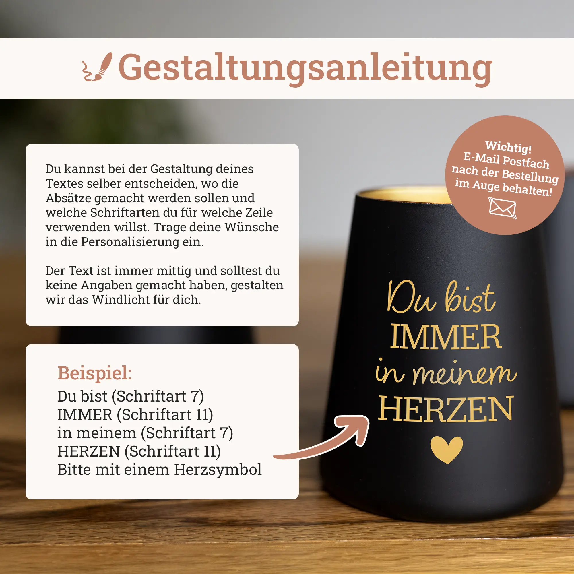 Das personalisierte Windlicht mit eurem Wunschtext ist ein besonderes Unikat, das individuell nach euren Wünschen angefertigt und graviert wird. Dadurch eignet es sich als ganz persönliches Geschenk zu Geburtstagen, Hochzeiten, Weihnachten und vielen anderen Anlässen, bei denen ihr ein besonderes Kerzenlicht verschenken möchtet, um euren Liebsten eine Freude zu machen. Entdeckt noch weitere individuelle Windlichter mit verschiedenen Motiven und Gestaltungsmöglichkeiten sowie unsere personalisierten Trauerlichter, um besonderen Menschen zu gedenken.