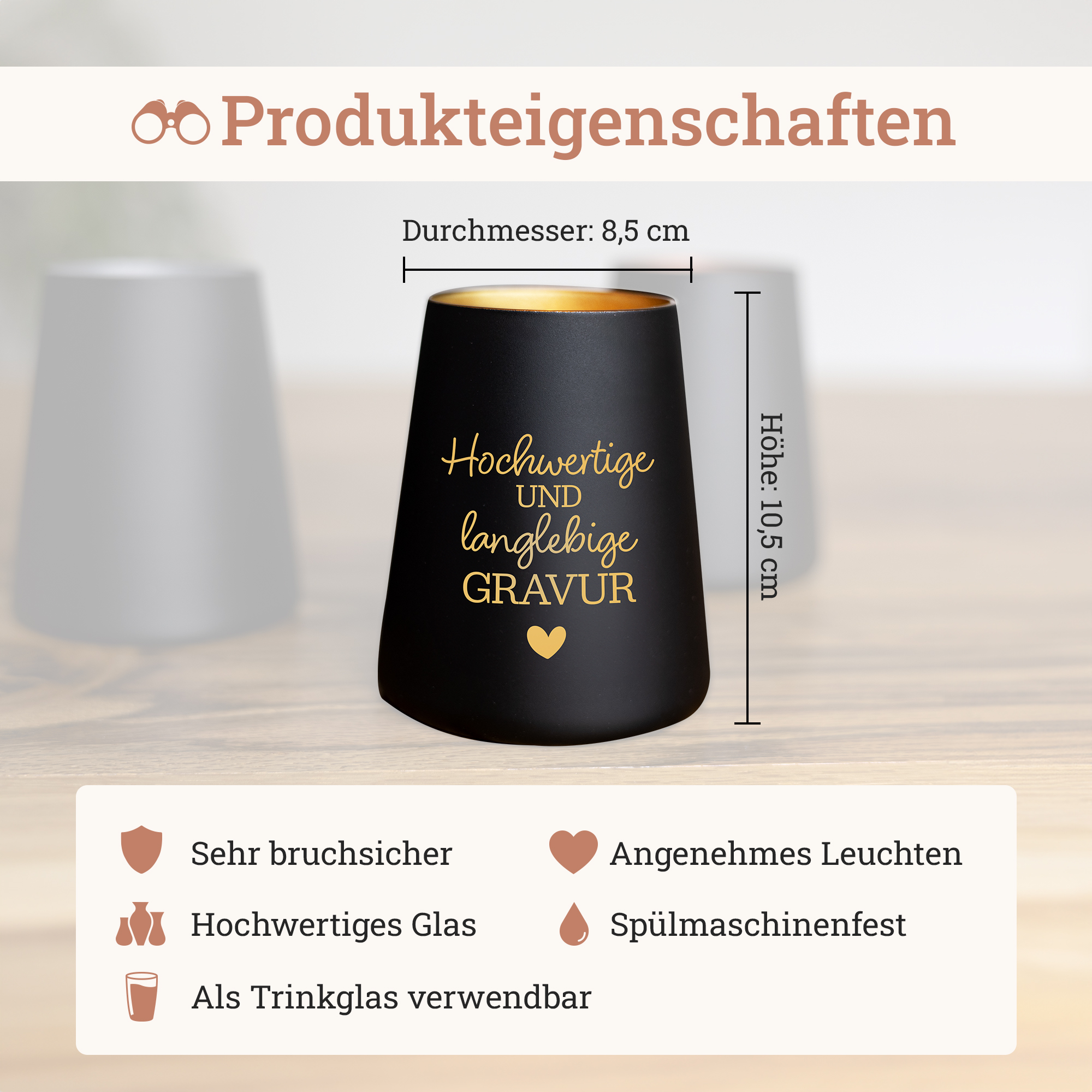 Mit dem personalisierten Windlicht aus hochwertigem Glas mit Wunschgravur habt ihr die Möglichkeit, ein ganz persönliches Kerzenlicht für Freunde, Familie oder ganz besondere Herzensmenschen zu gestalten. Bei der Gestaltung des anmutigen Kerzenglases in Trapezform könnt ihr euren Wunschtext eintragen, der dann per Lasergravur auf das Glas übertragen wird. Seien es Sprüche, Zitate, Namen oder andere Gestaltungen, eventuell zusammen mit kleinen Motiven. Wenn ihr das Windlicht mit einer Kerze oder einer kleinen Lichterkette von innen beleuchtet, scheint das Licht sanft durch die Gravur hindurch und verleiht dem Windlicht eine ganz besondere Optik. So wird es zu einem individuellen Geschenk für eure Liebsten.