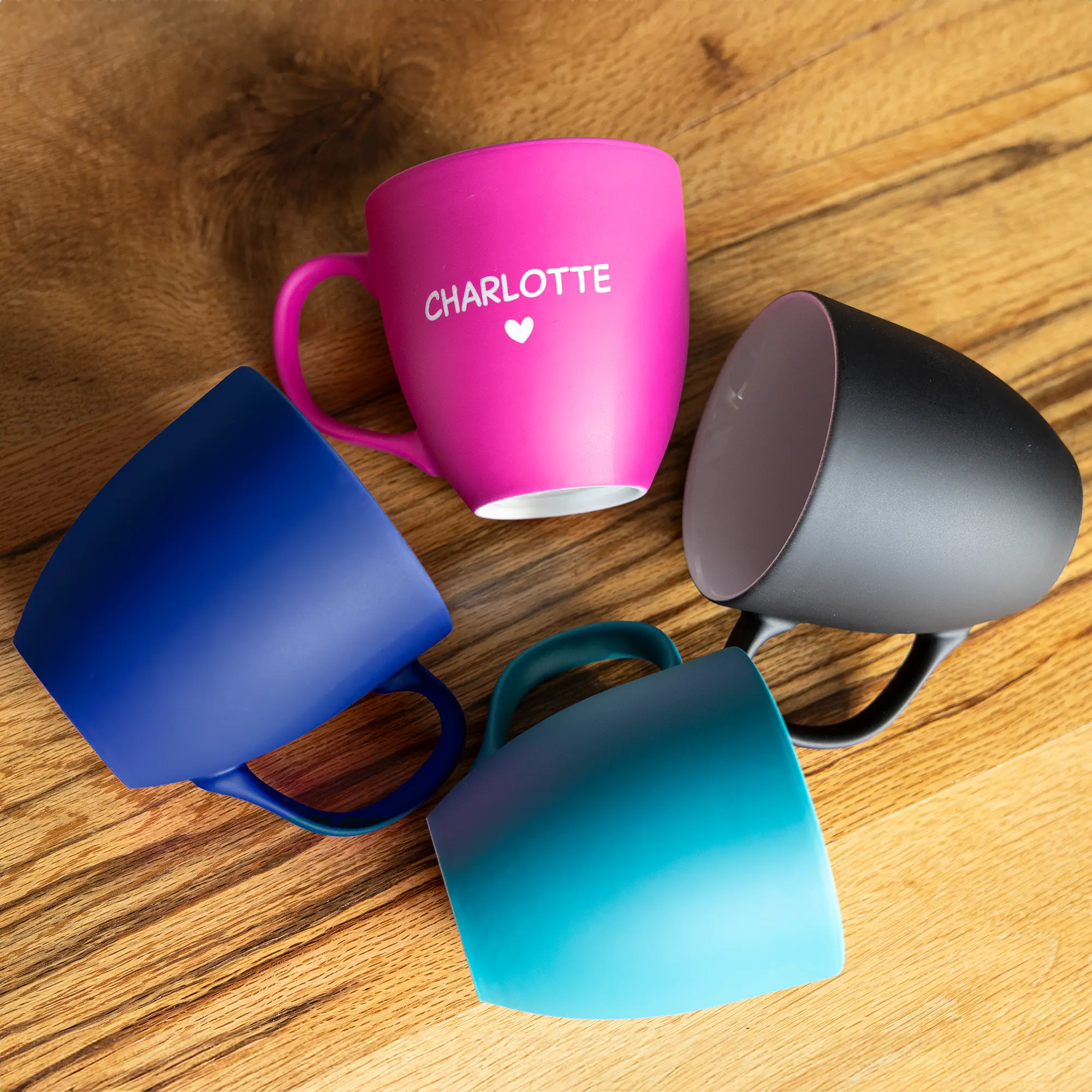 Bei der Gestaltung eurer Kaffeetasse aus Porzellan habt die Auswahlmöglichkeit aus den Farben Blau, Grün, Grau, Lila, Pink (Matt oder Glänzend), Türkis und Schwarz. Somit könnt ihr nicht nur für euch sondern auch für eure Freunde oder Familienmitglieder diese Tasse in deren Lieblingsfarbe holen, wodurch es auch zu einem tollen Geschenk für Geburtstage oder andere passende Feiertage wird. Macht euch und anderen Kaffeetrinkern eine besondere Freude mit dieser schönen und großen Tasse!