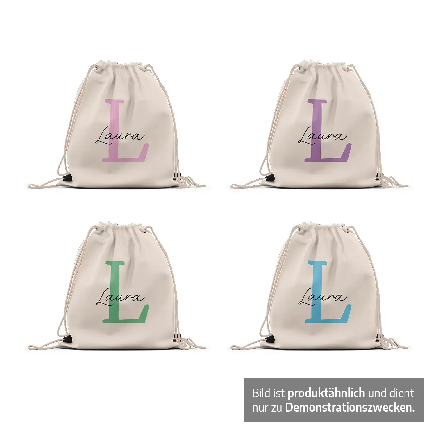 Individueller Turnbeutel (Stofftasche) mit den Anfangsbuchstaben und Namen eurer Kinder. Wählt zwischen 4 verschiedenen Farben für den Großbuchstaben aus und gebt den Namen eurer Kinder oder einen anderen Wunschnamen an.