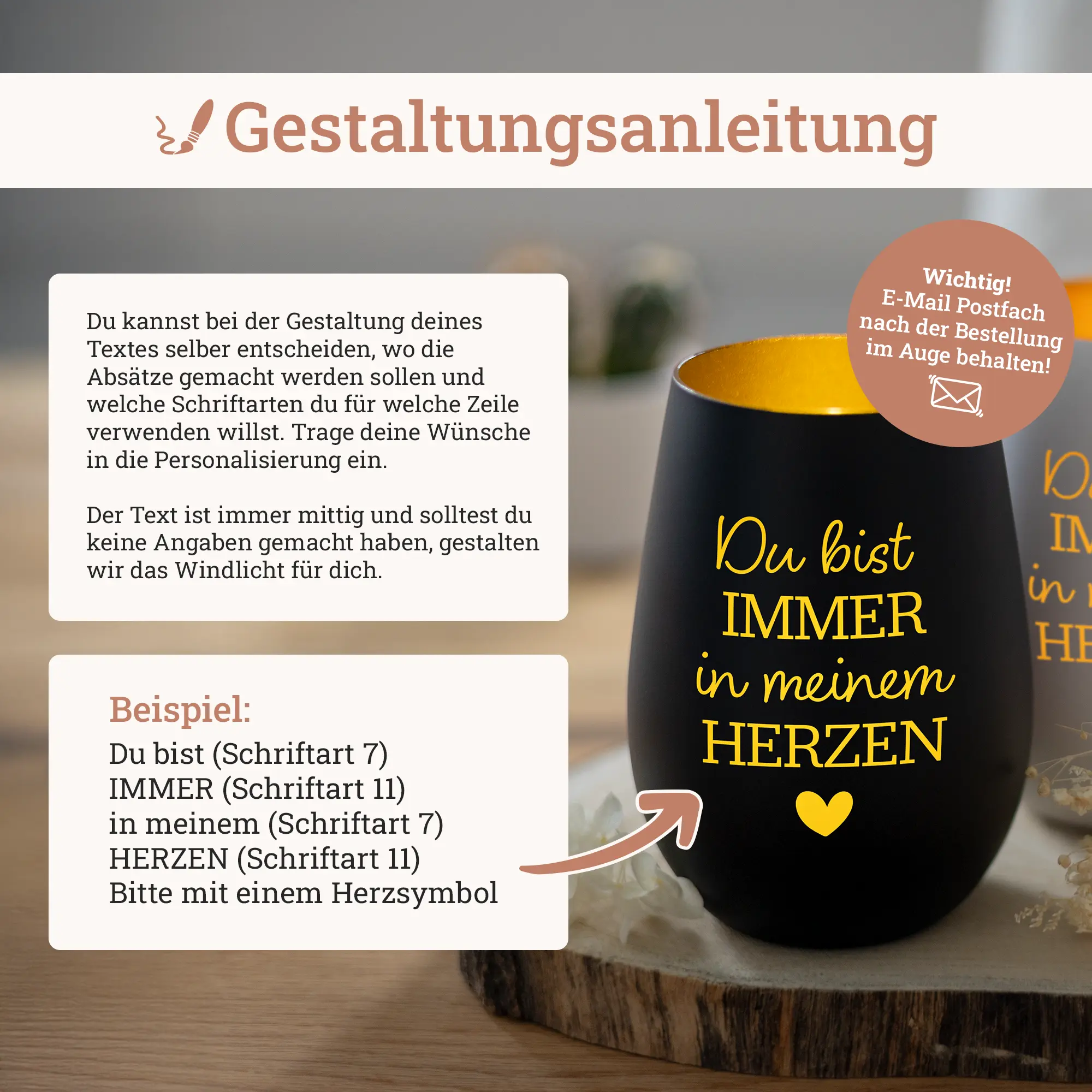 Bei unserem personalisierten Windlicht mit Wunschtext könnt Ihr eure Botschaften, Kurzgedichte, Wünsche usw. als wunderschöne Dekoration verschenken oder im eigenen Wohnzimmer aufstellen. Der Wunschtext wird in einer von 12 wählbaren Schriften per Laser in das Glas graviert. Das Kerzenlicht scheint so durch die Schrift hindurch und verleiht dem Raum ein gemütliches Ambiente und setzt besonders schöne Akzente im Wohnbereich. Familien mit kleinen Kindern können die Kerzengläser auch super mit LED-Teelichtern beleuchten. So kann nichts passieren, sollte das Windlicht doch einmal umfallen.